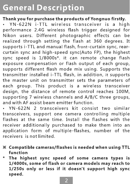 YONGNUO PHOTOGRAPHIC EQUIPMENT YN622N i-TTL Wireless Flash Trigger Transceiver User Manual YN 622N V1 1