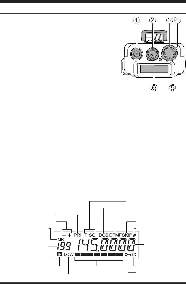 The liquid crystal display shows seven frequency digits, memory selection, CTCSS tone