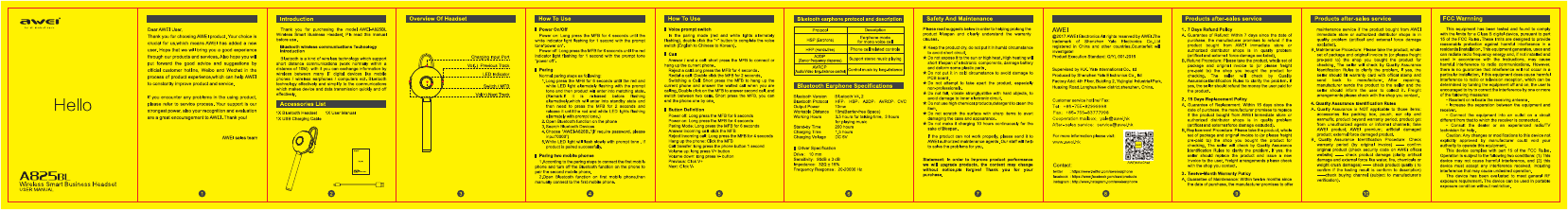 Shenzhen Yale Electronics Co., Ltd. Bluetooth Sport Headset A25BL Manual FCC