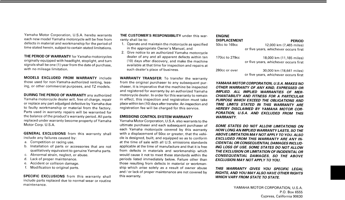 the date of manufacture. Yamaha has met these standards without reducing the performance or economy of operation of the