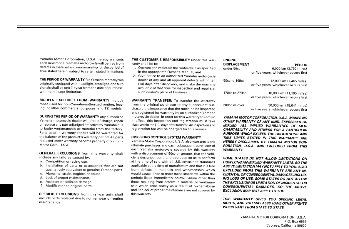 the date of manufacture. Yamaha has met these standards without reducing the performance or economy of operation of the