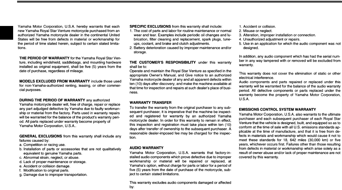 Congratulations on your purchase of the Yamaha Royal Star™ VENTURE®. This model is the result of Yamaha’s vast ex-