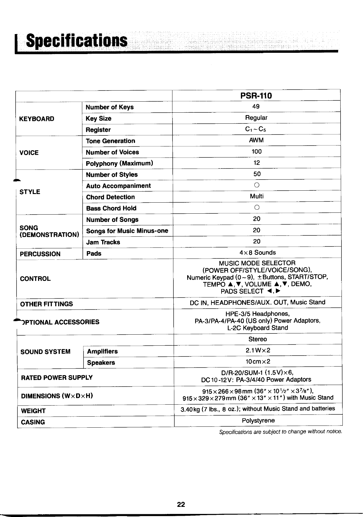 Yamaha PSR 110 Owner's Manual (Image) PSR110E