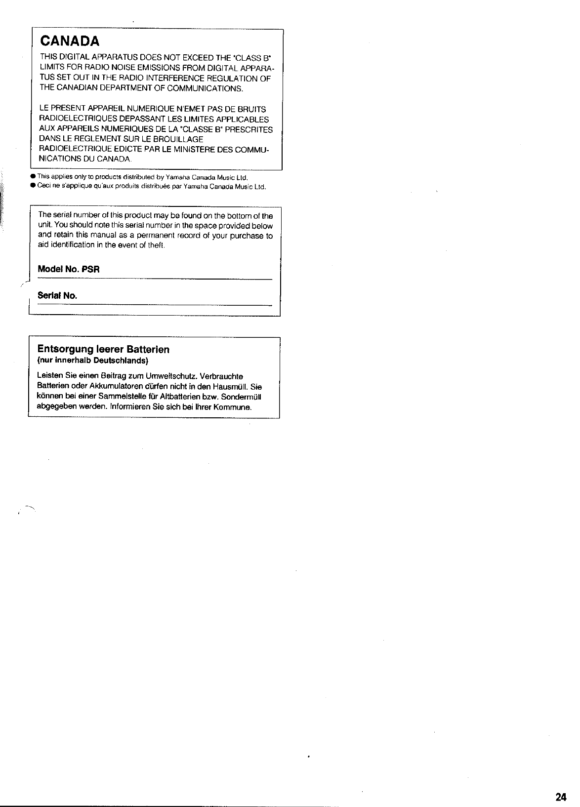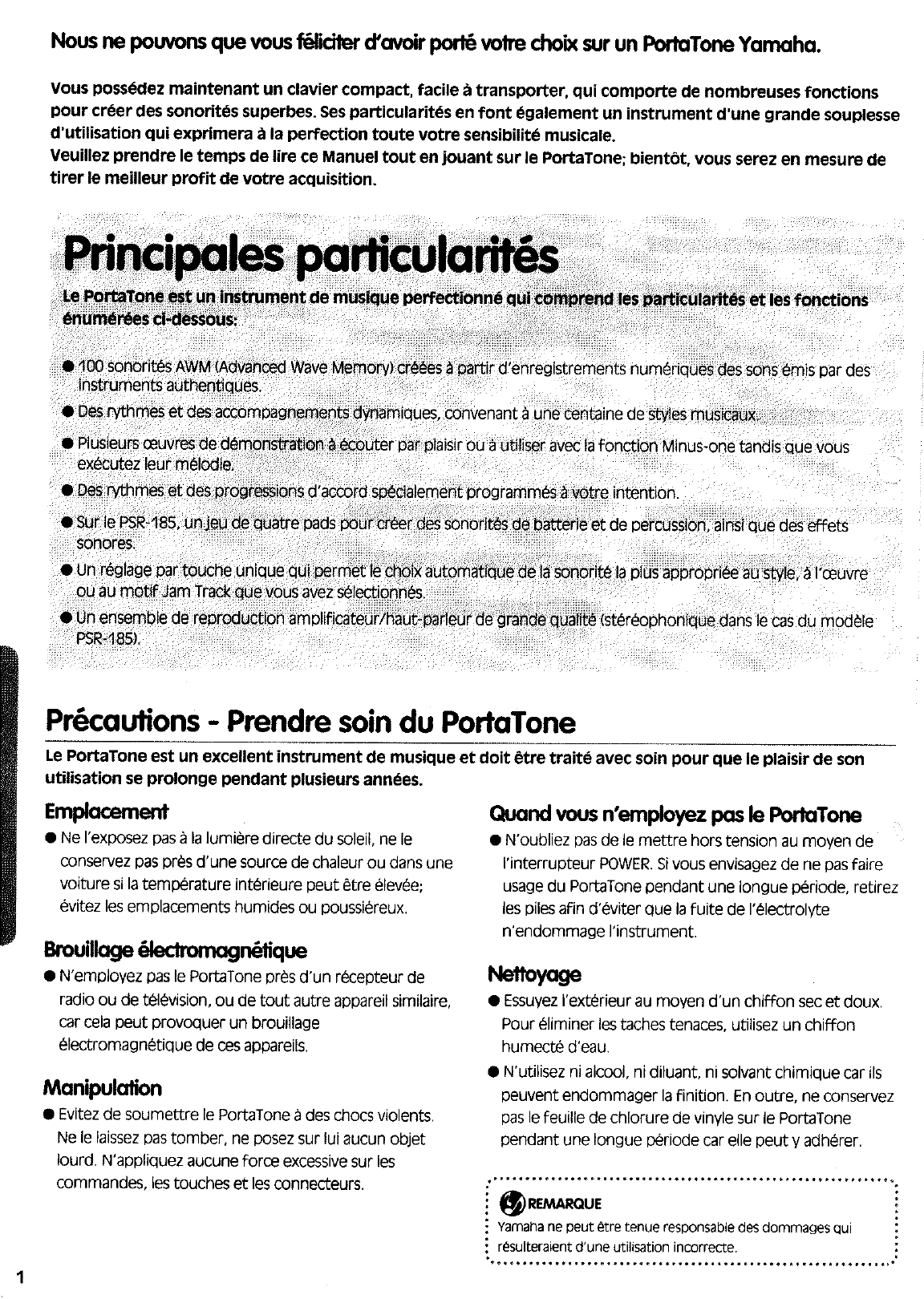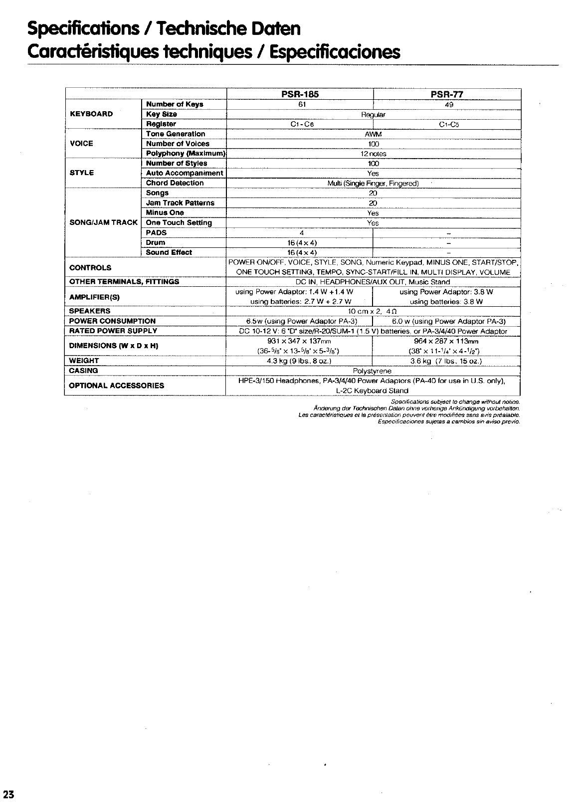 Yamaha PSR 185/PSR 77 Owner's Manual PSR185F
