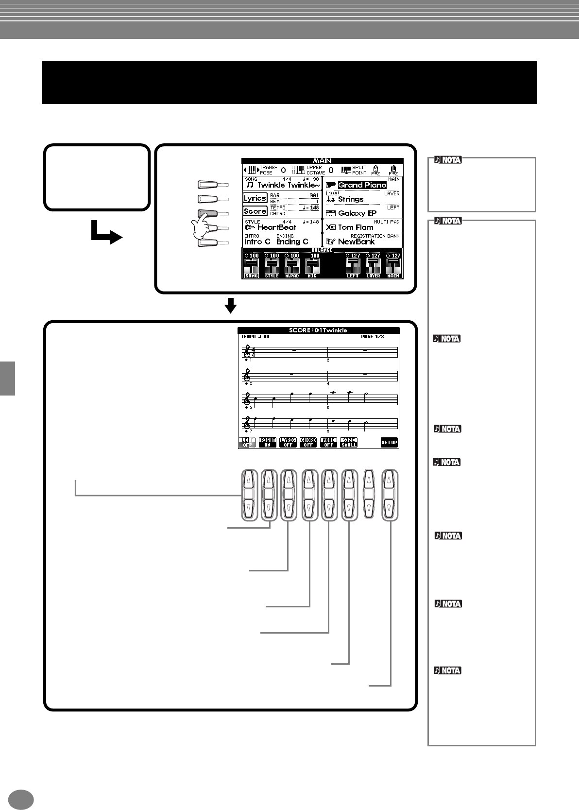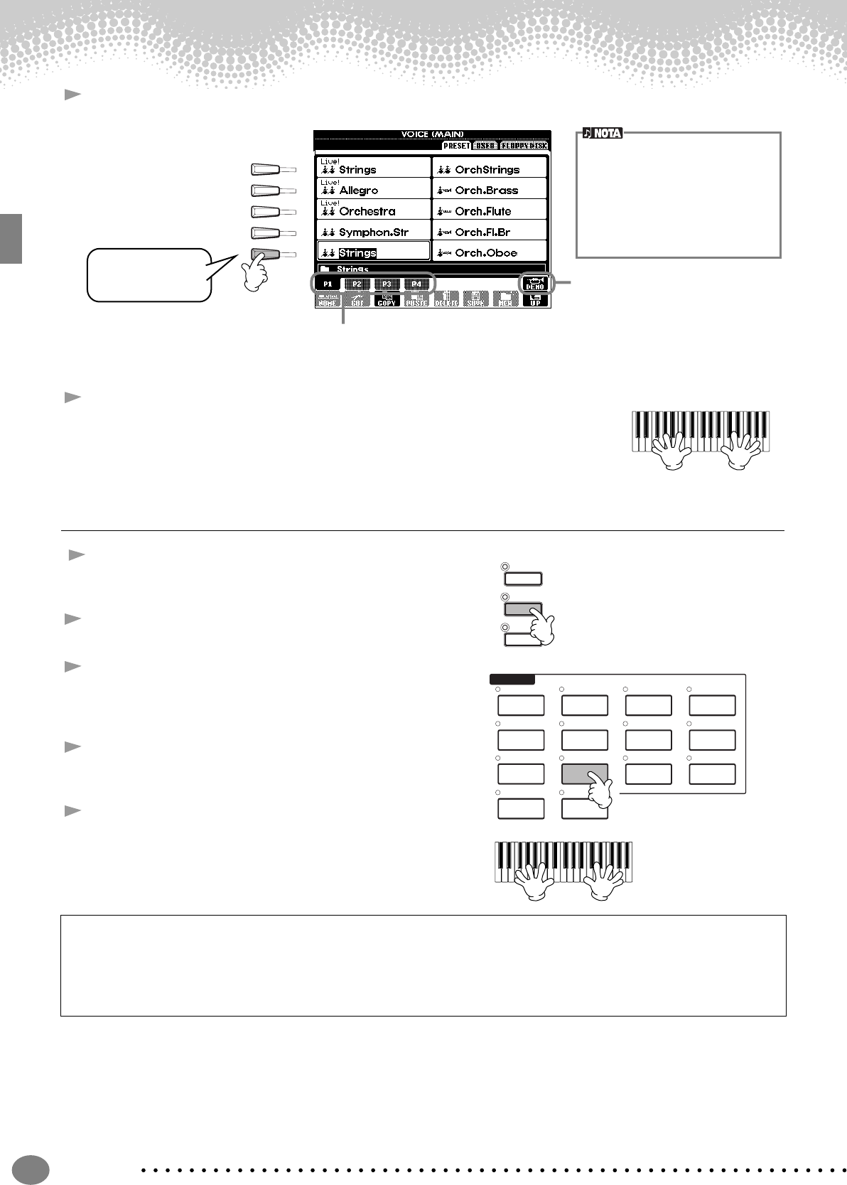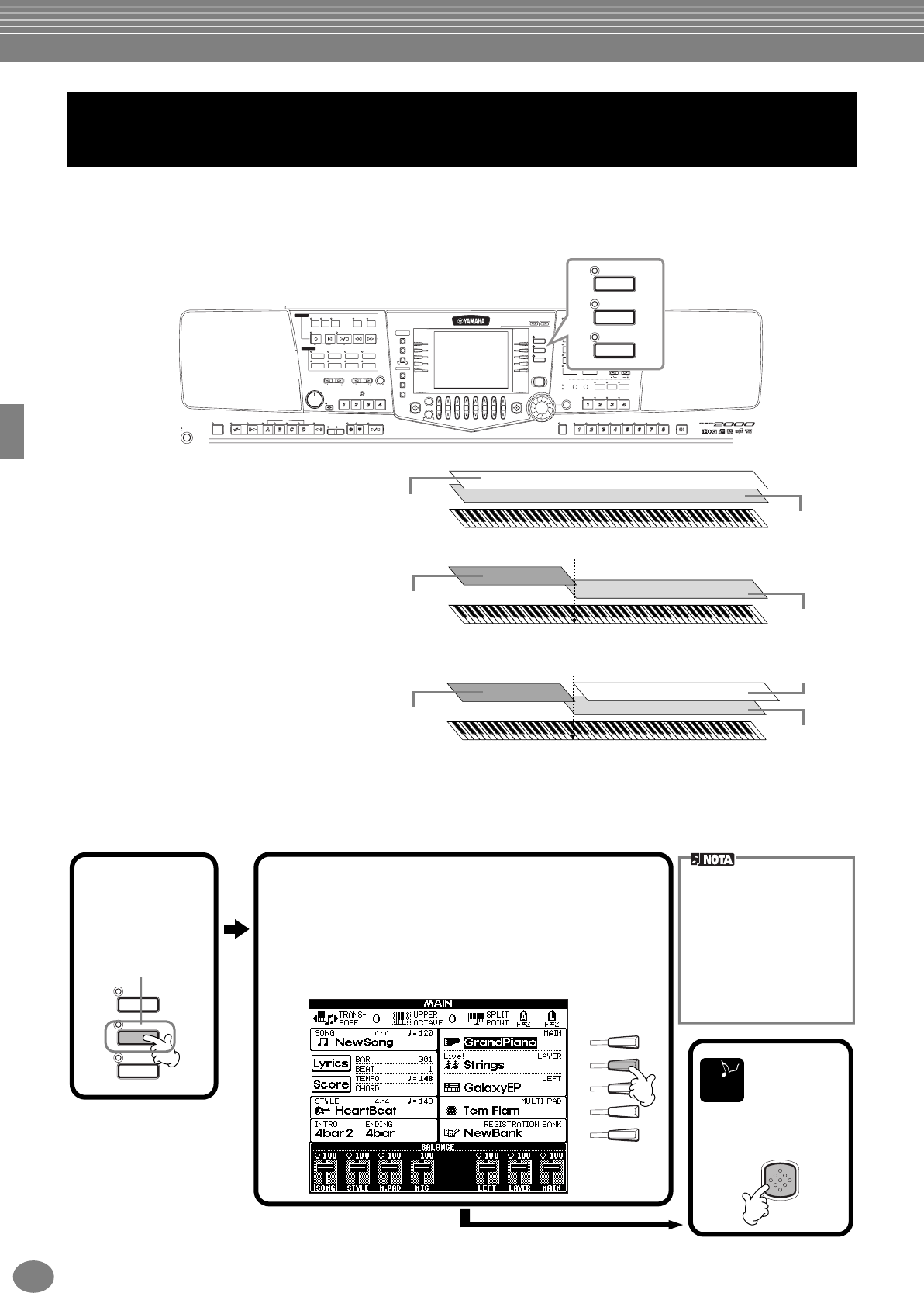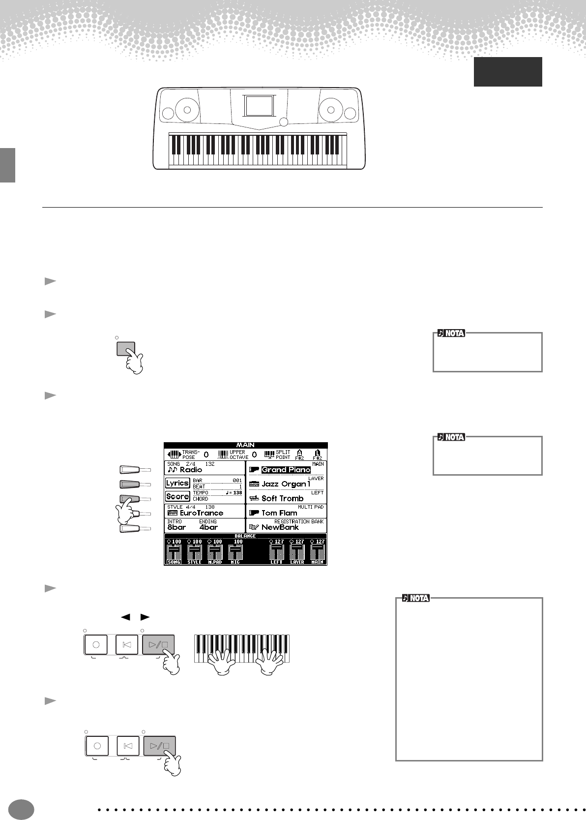 - Ajuste de parámetros relacionados con el acompañamiento automático: Style Setting, Split Point y ...
