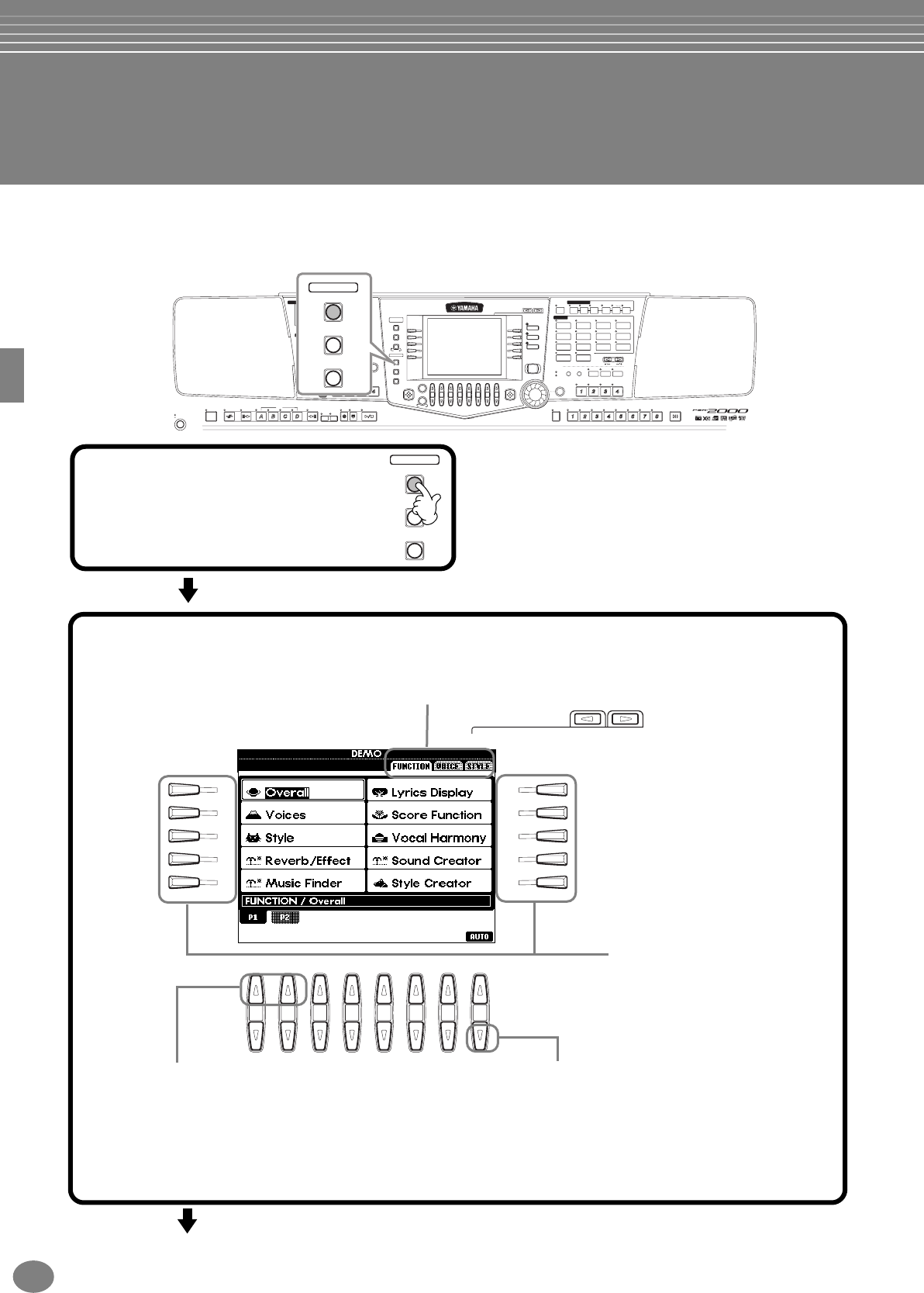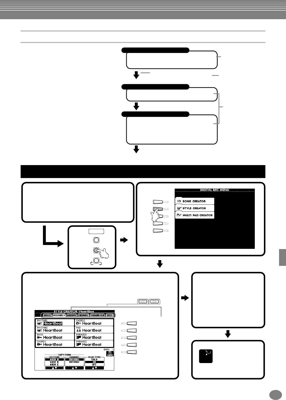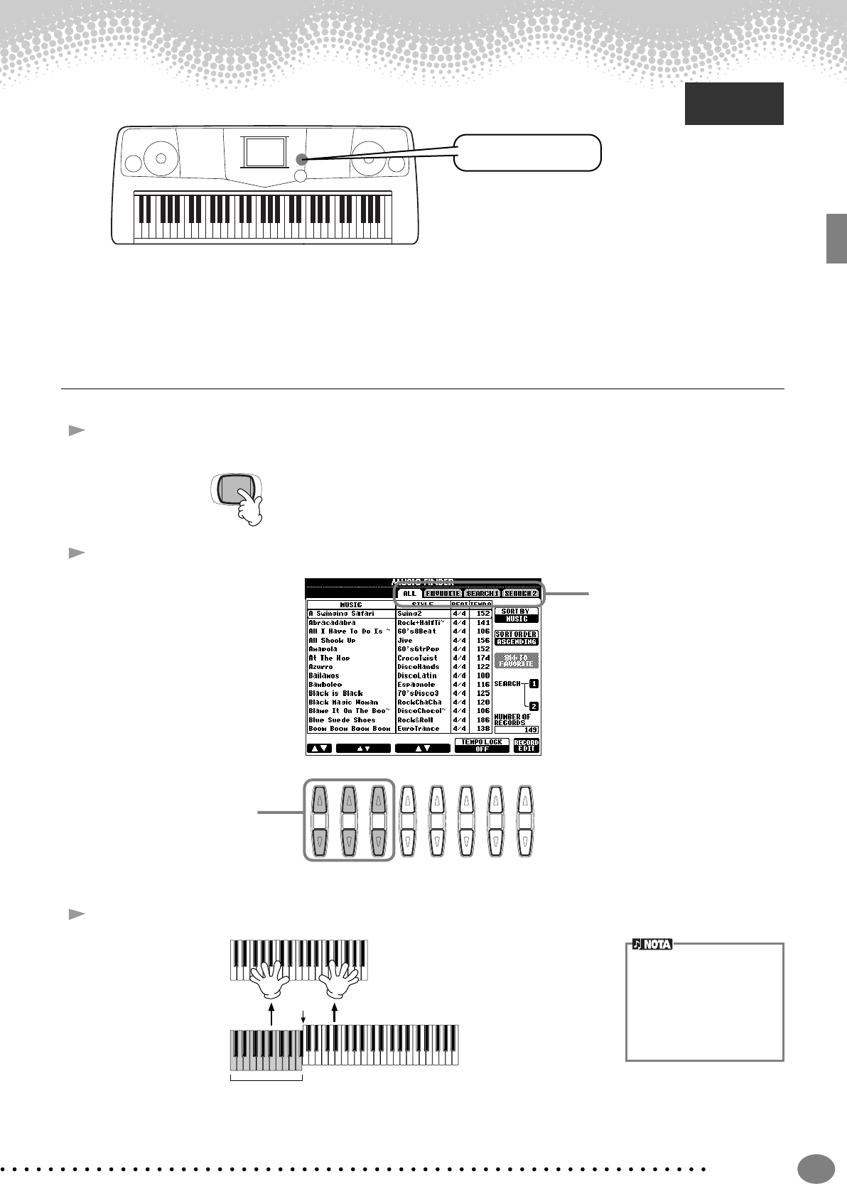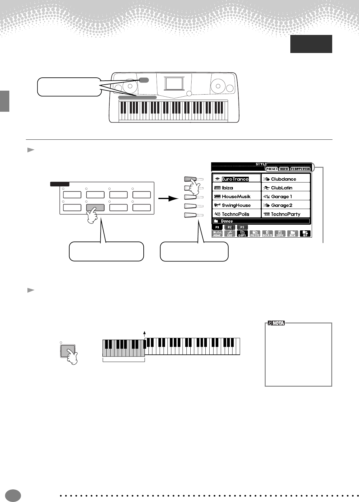 - Ajuste de parámetros relacionados con el acompañamiento automático: Style Setting, Split Point y ...