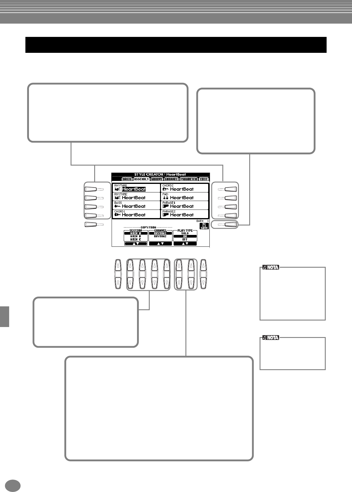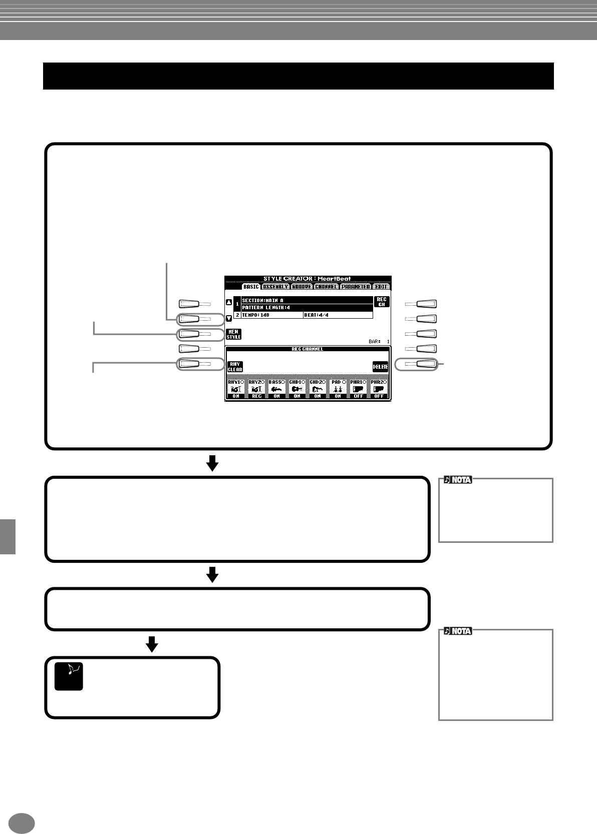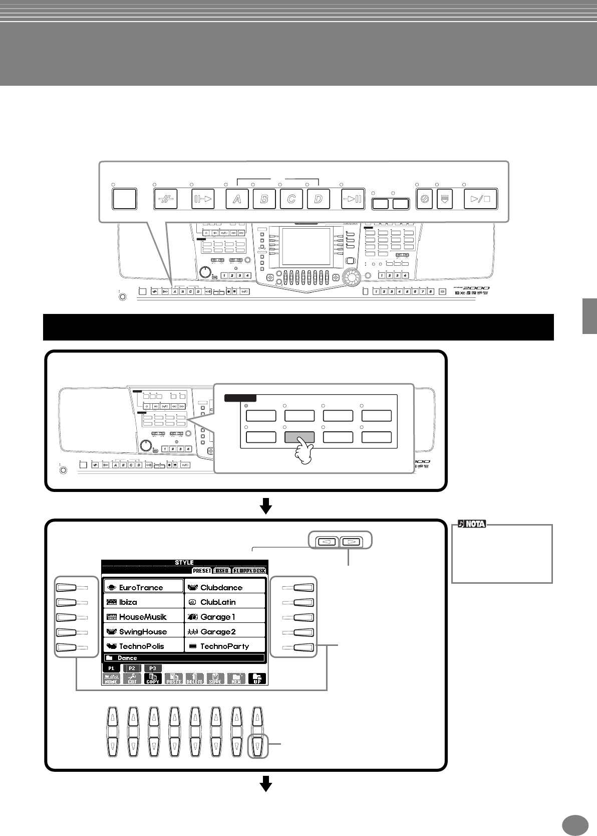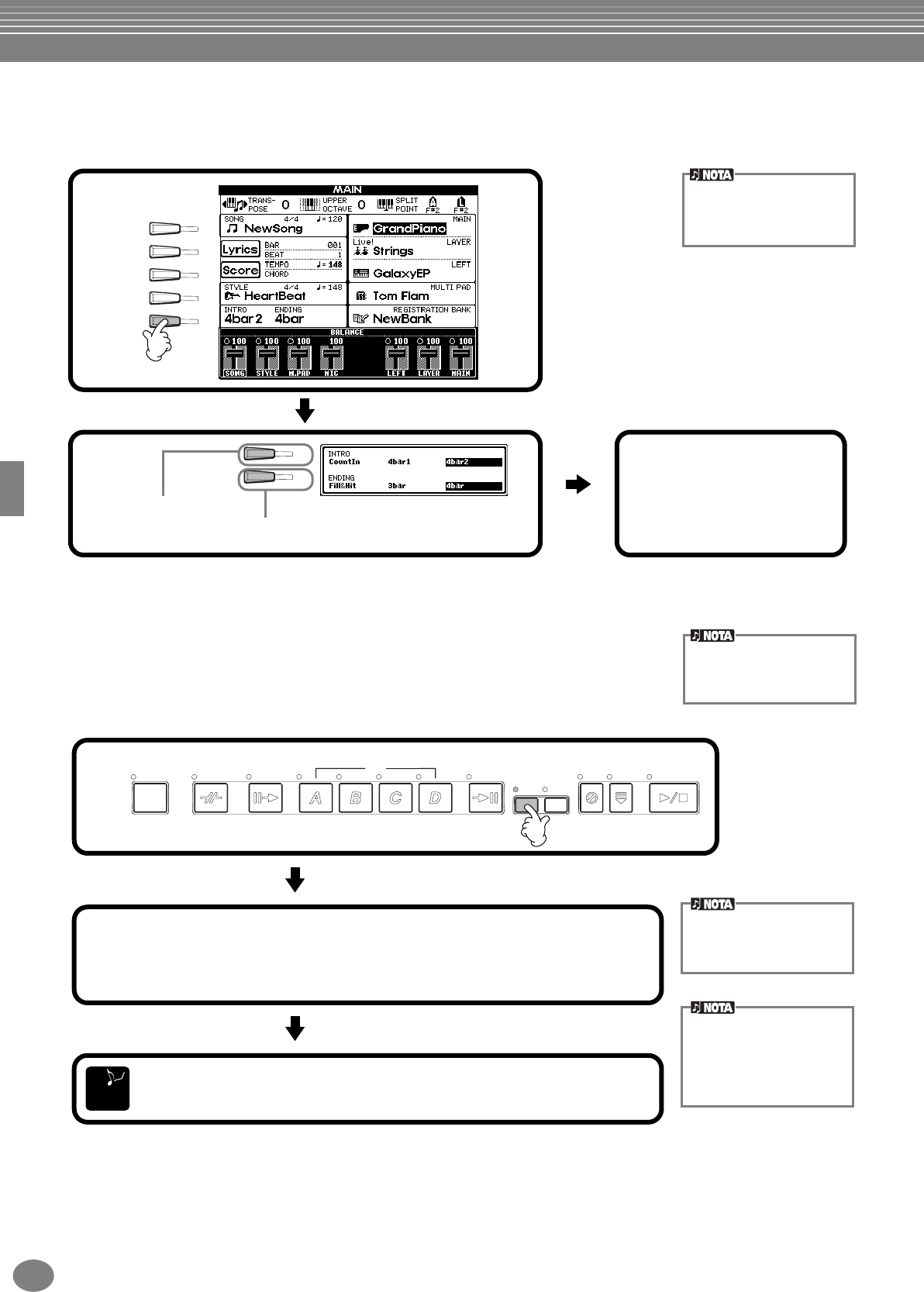 - Disposición del patrón de estilo (SECCIONES: MAIN (principal) A/B/C/D, INTRO (preludio), ENDING (...
