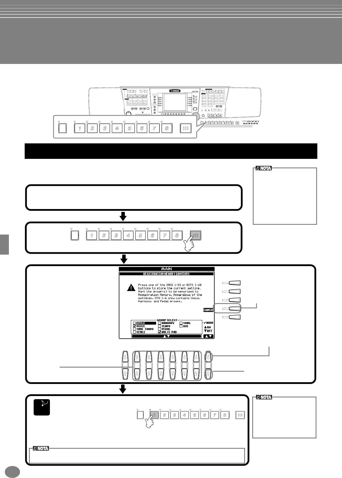 - Guardar y recuperar ajustes personalizados del panel: Registration Memory (memoria de registro)