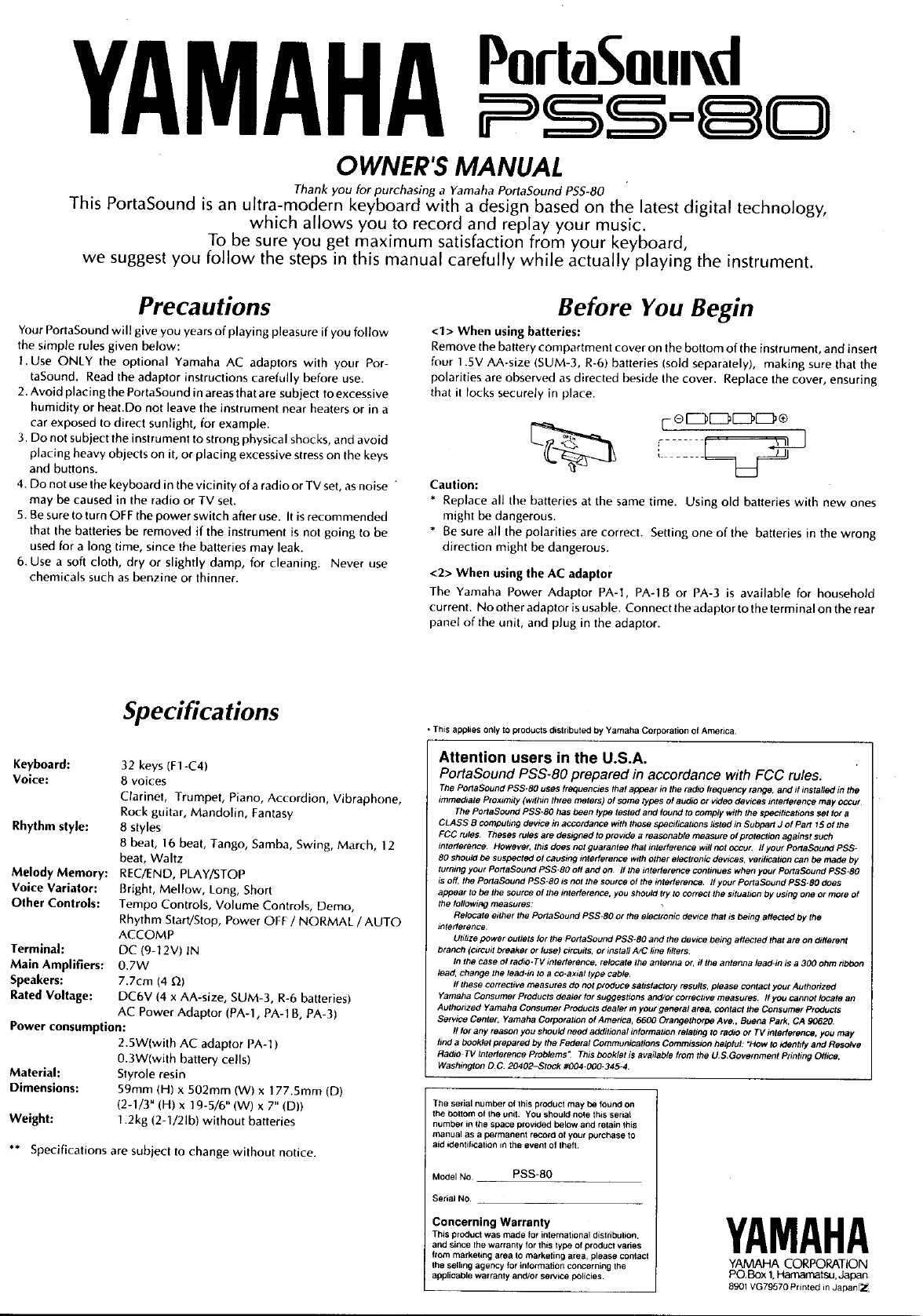 Yamaha Corporation PSS-80 Owner's Manual pss80e Yamaha Corporation - PSS-80 - Owner's Manual