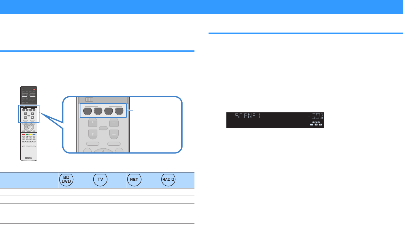 - Selecting the input source and favorite settings with one touch (SCENE)