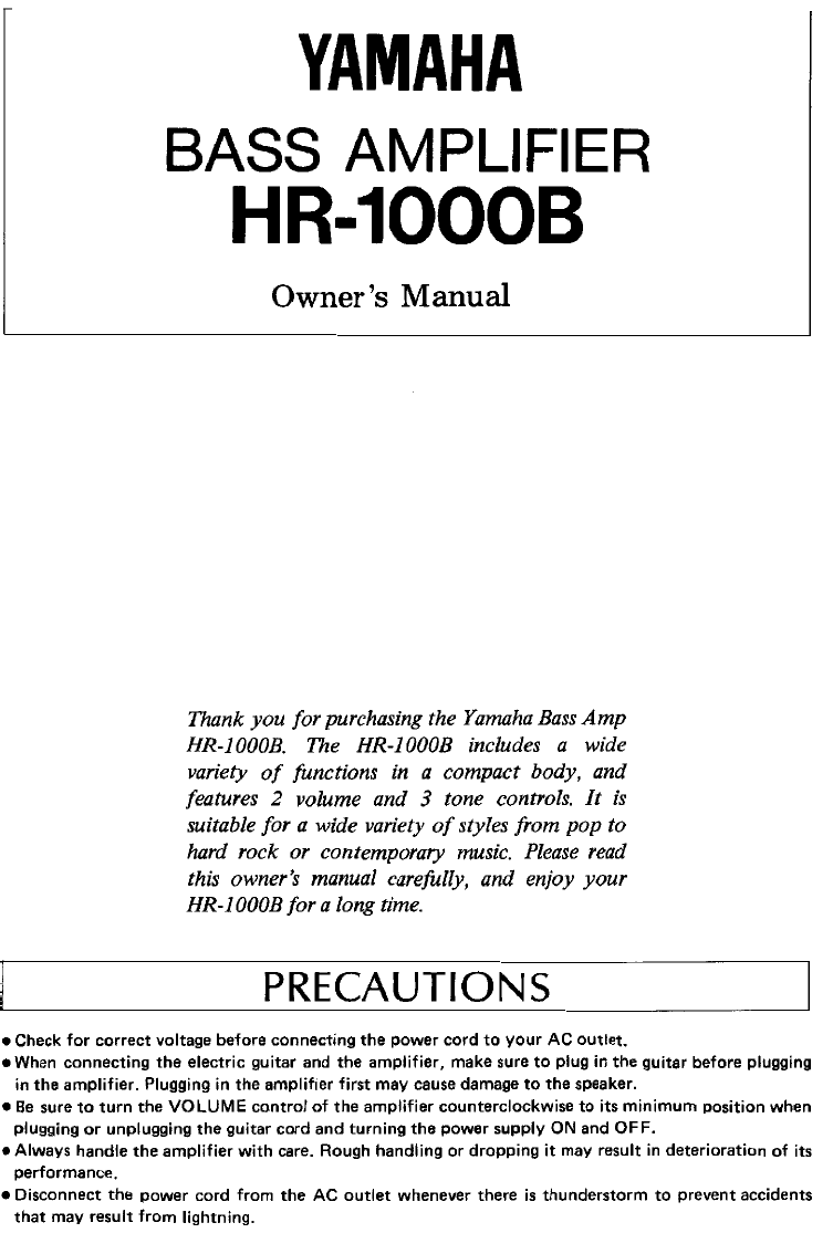 User Manual: Yamaha HR-1000B Owner's Manual (Image)