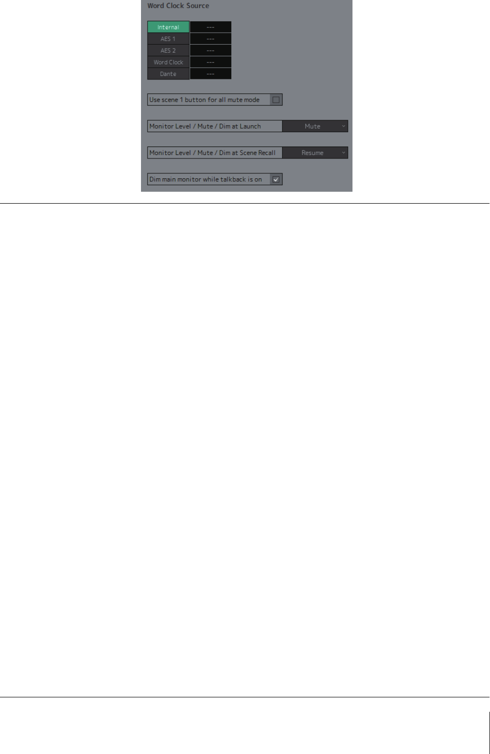 Monitor Level/Mute/Dim at Scene Recall ...................... 35