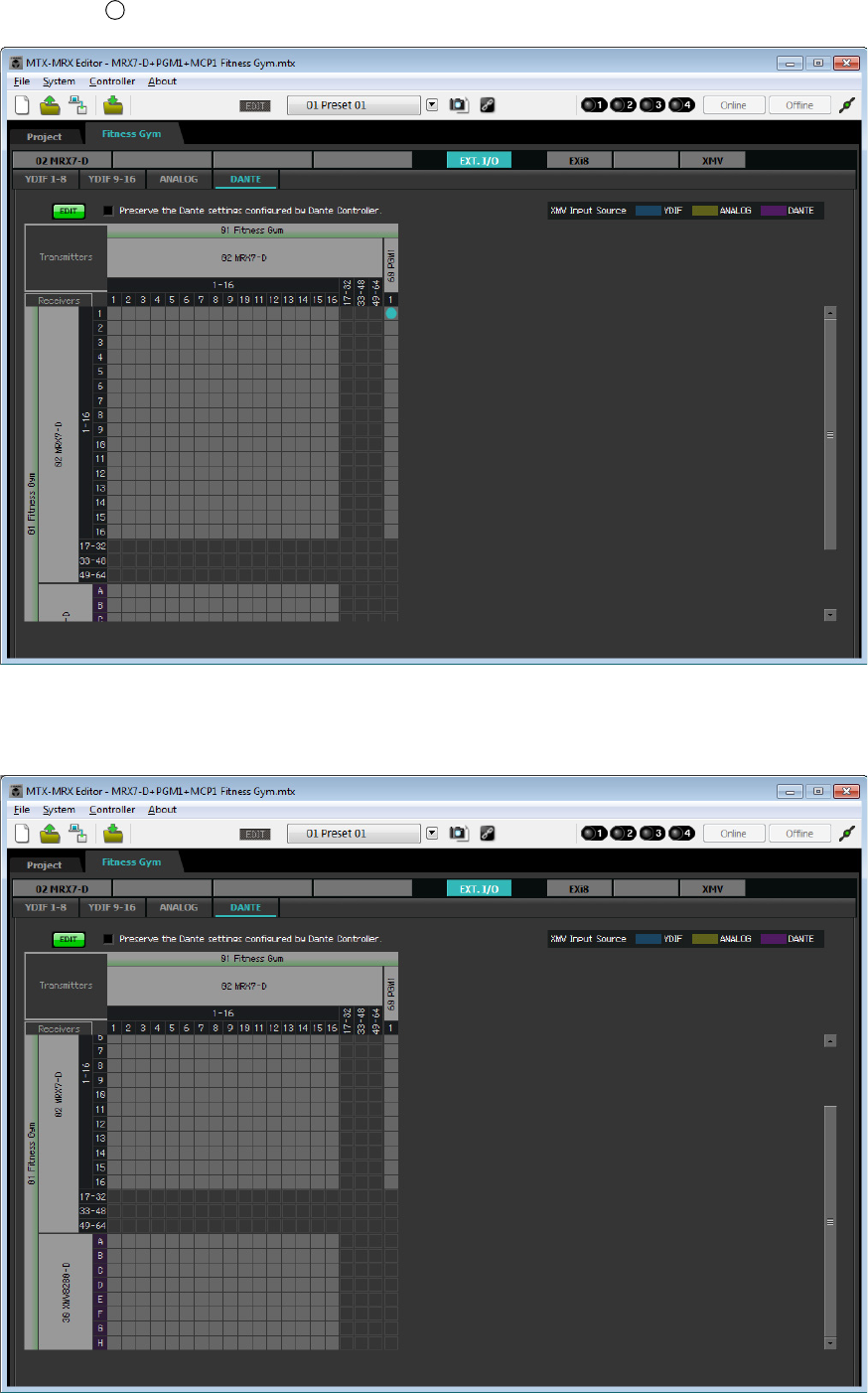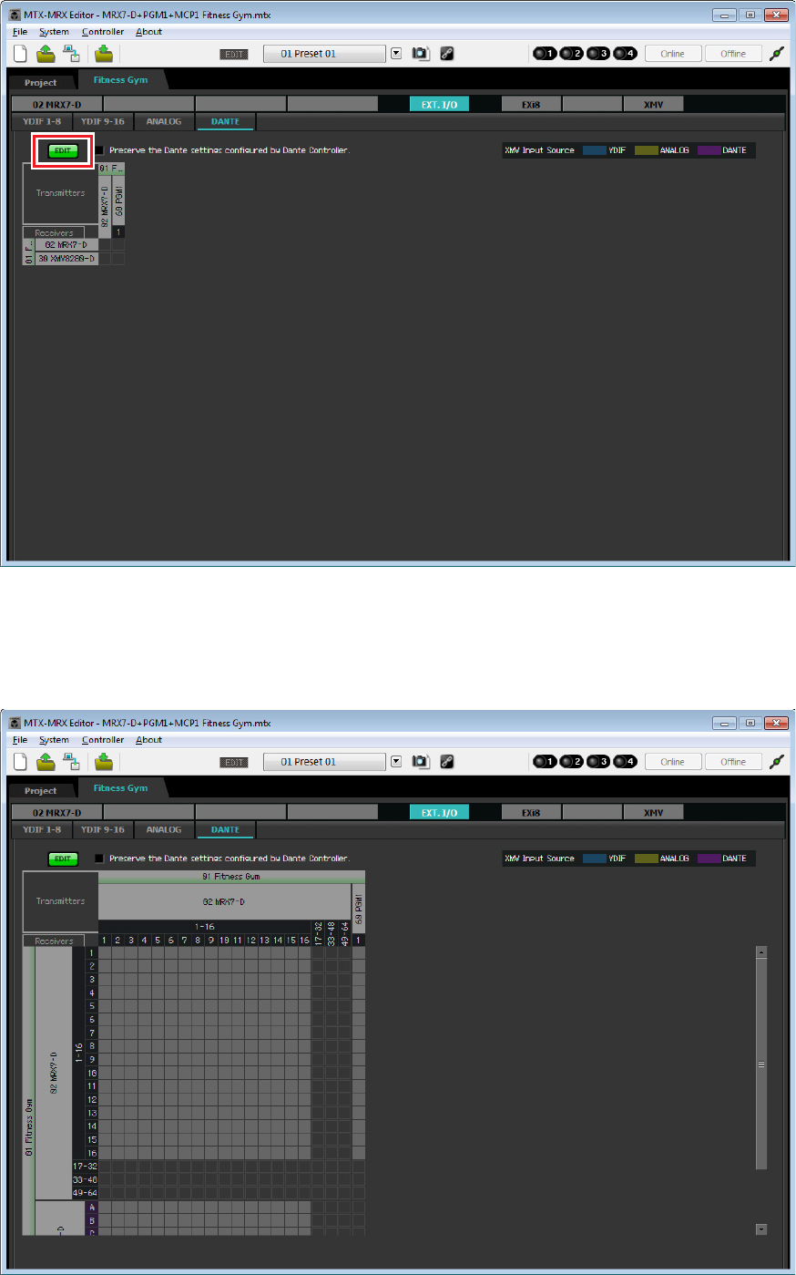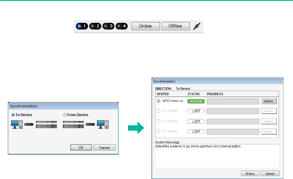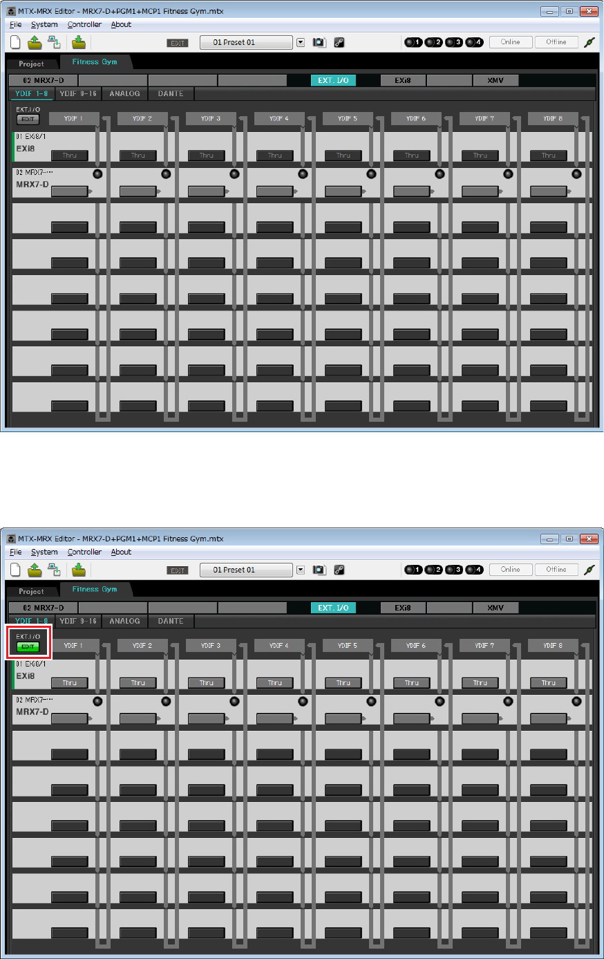 在MTX-MRX Editor 的右上方,单击 [Online] 按钮。当装置成功联机时,左侧的指示灯 1将以蓝色点亮。