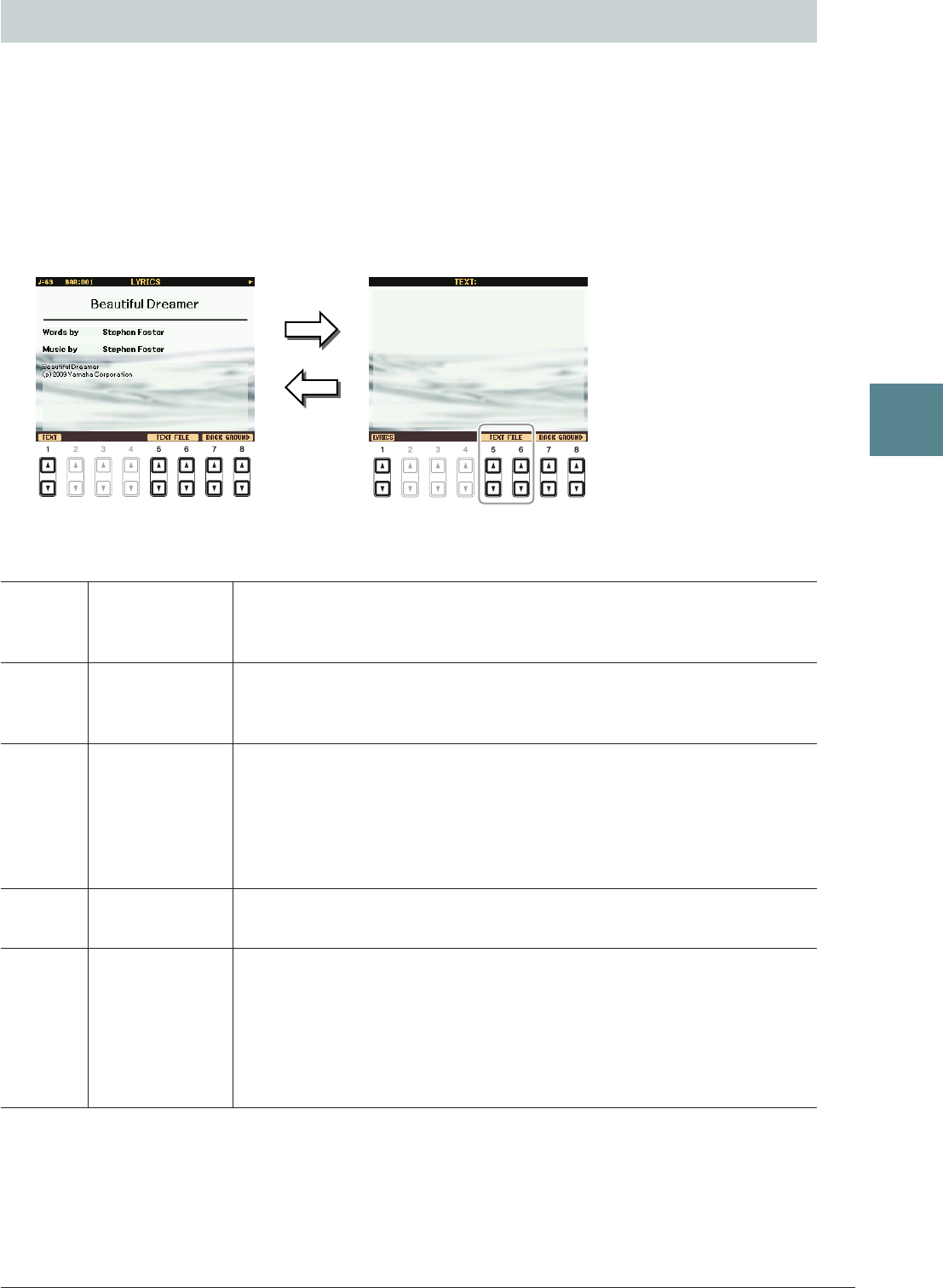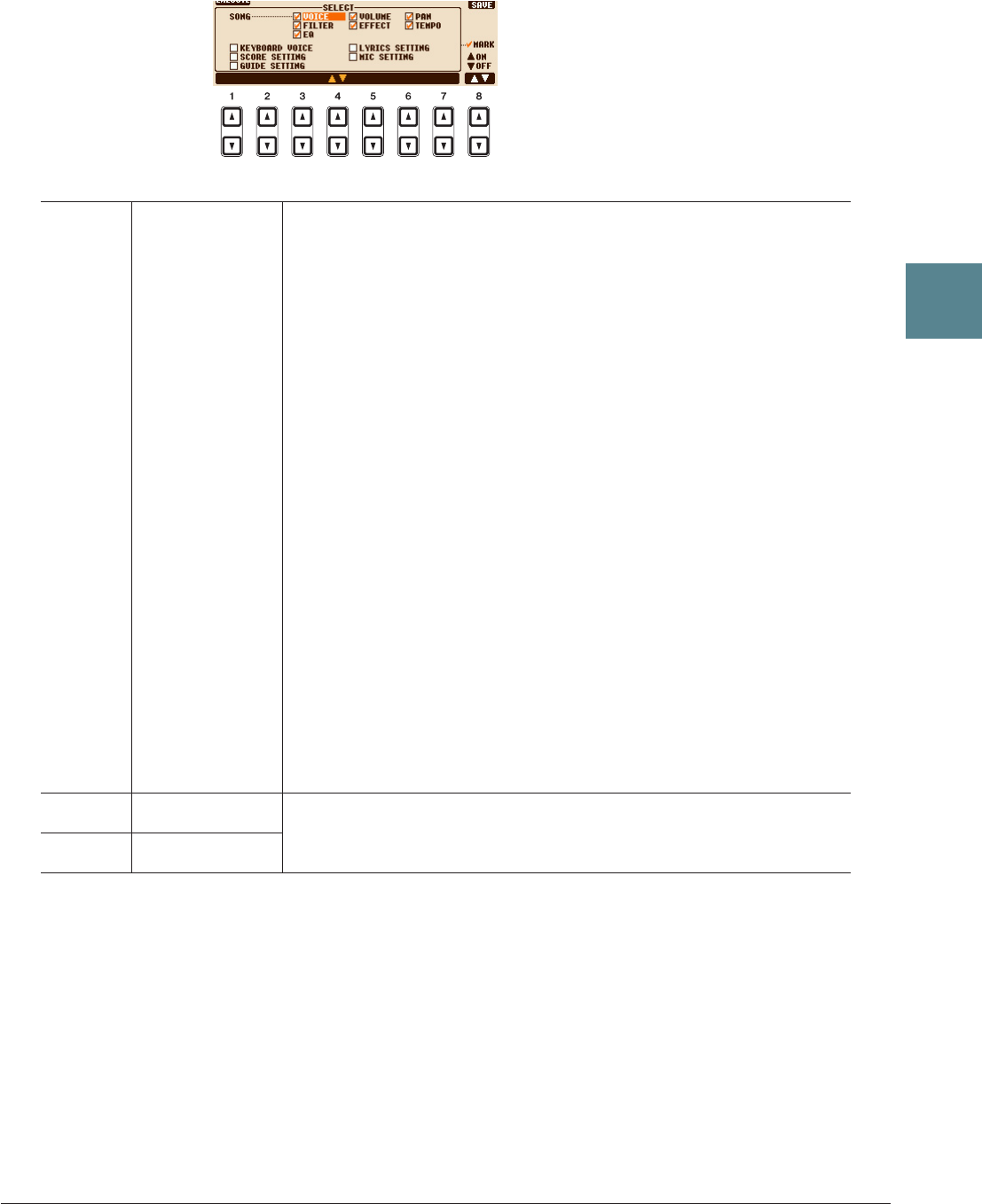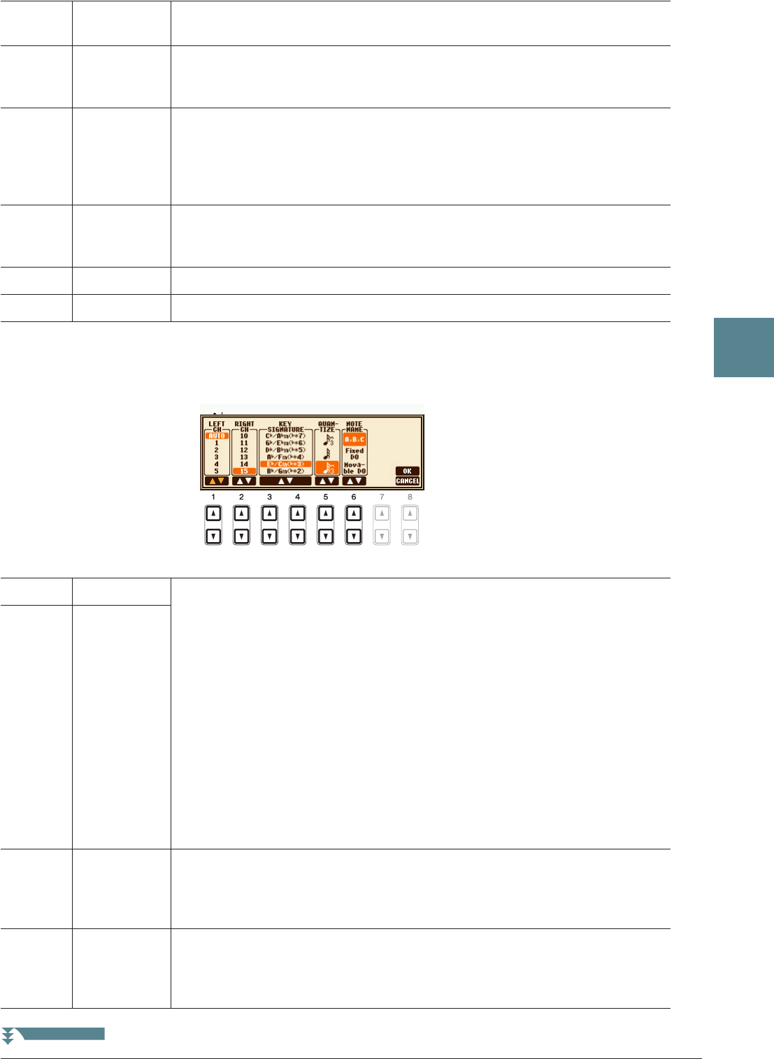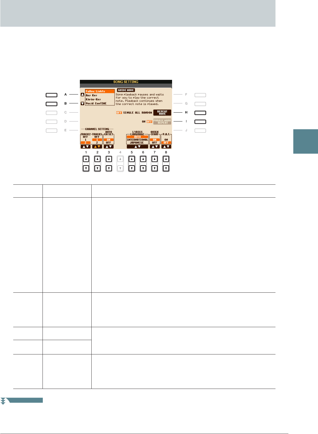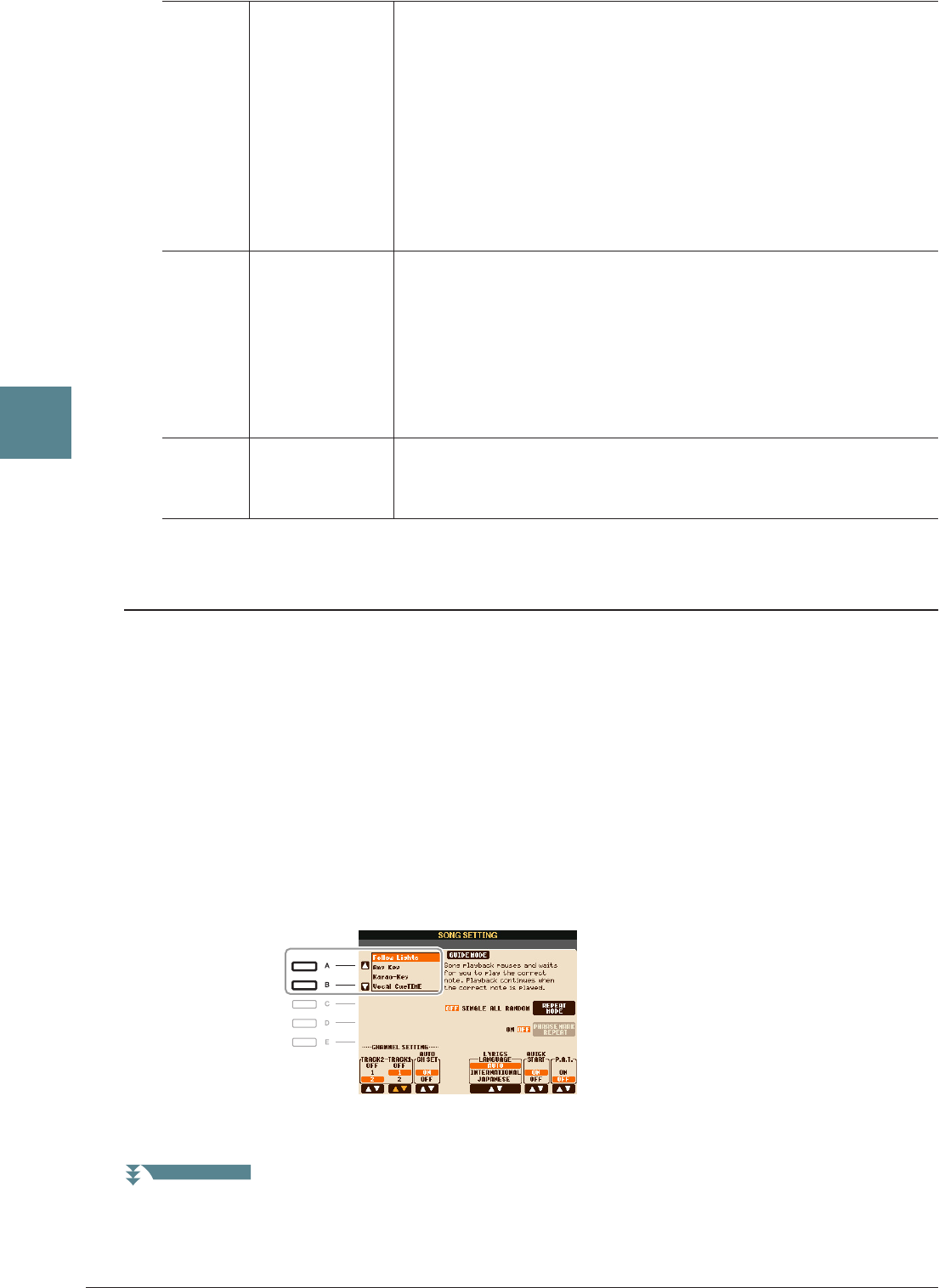 - Parámetros relacionados con la reproducción de canciones (ajustes de repetición, ajustes de canal o función de guía)