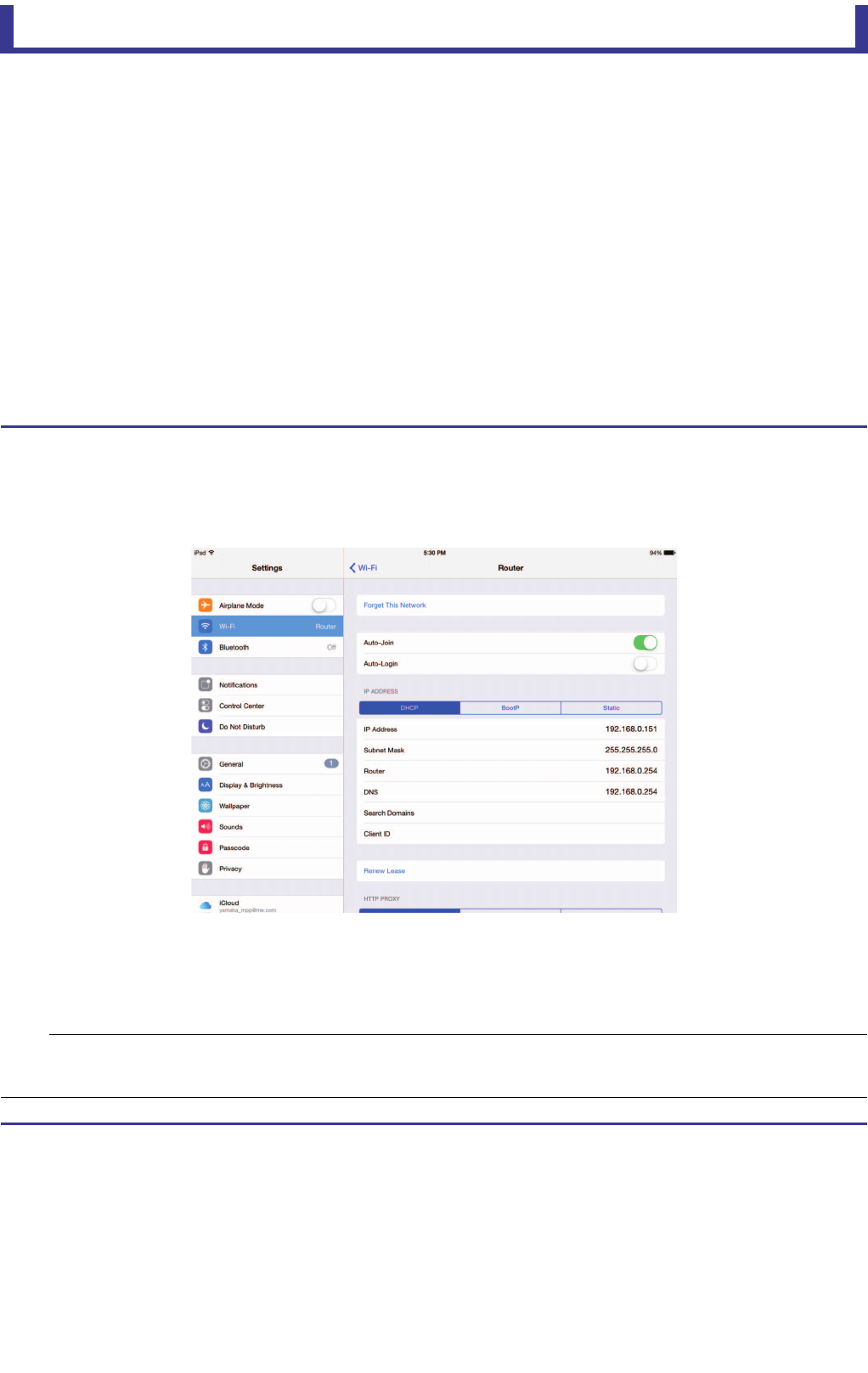 4. Tap [DHCP], and then confirm that the iPad has received settings for IP address, subnet mask, router, and DNS.