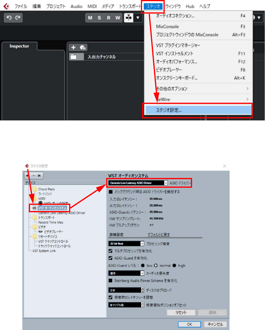 CubaseAIのメニューバー「スタジオ」から「スタジオ設定」をクリックします。