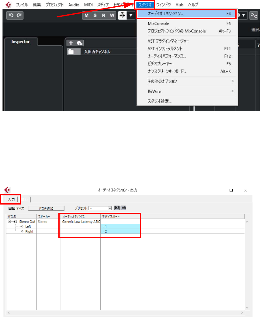 8. CubaseAIのメニューバー「スタジオ」から「オーディオコネクション」をクリック