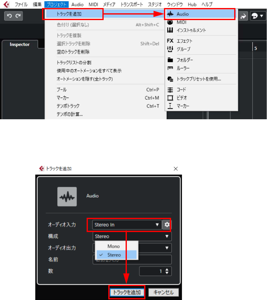 10. CubaseAIのメニューバー「プロジェクト」から「トラックを追加」を選択し、