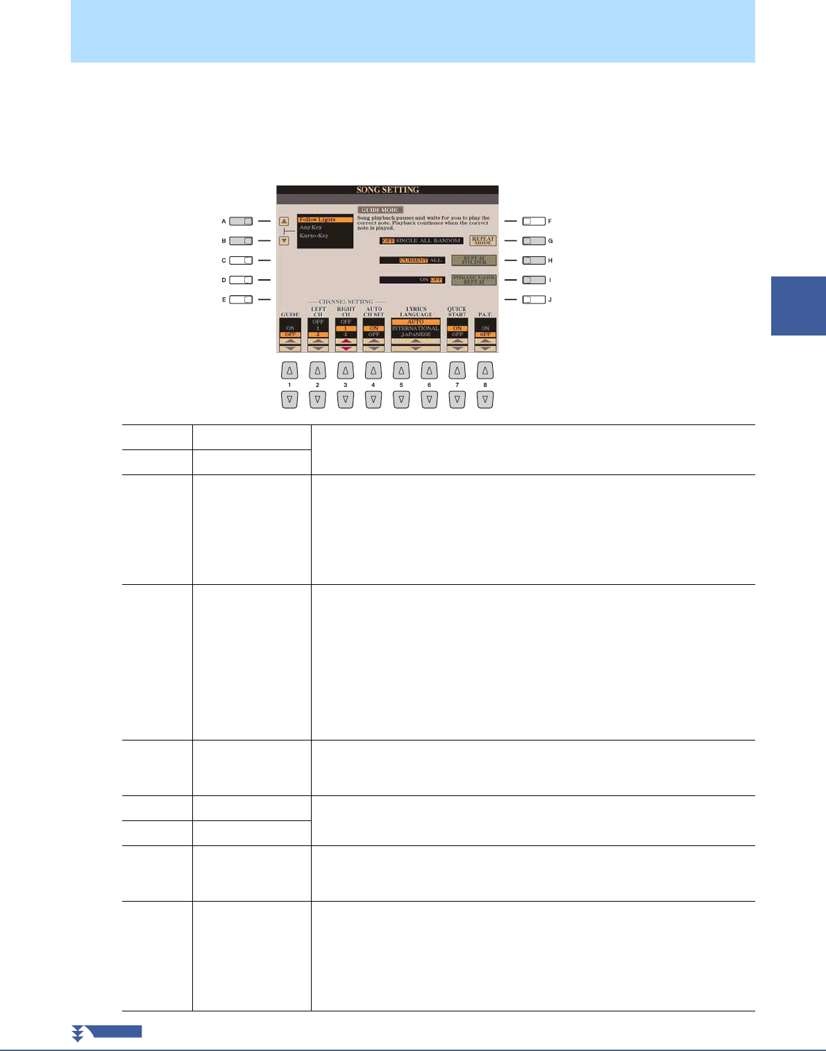Song Playback Related Parameters (Repeat settings, Channel settings, Guide Function) .................. 57