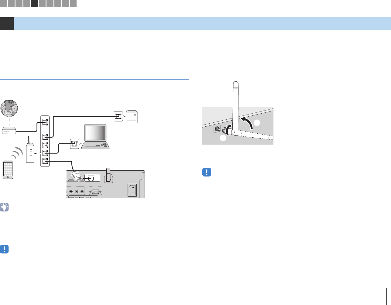 - Connecting a network cable or the wireless antenna