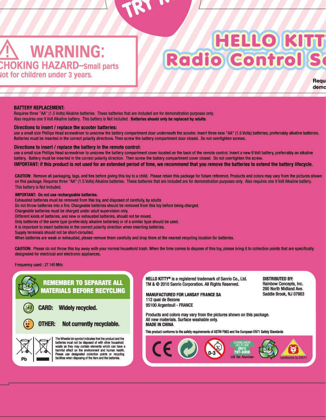 Yick Shun Electronic Toys 10962 Remote Controller for Toy User Manual Manual