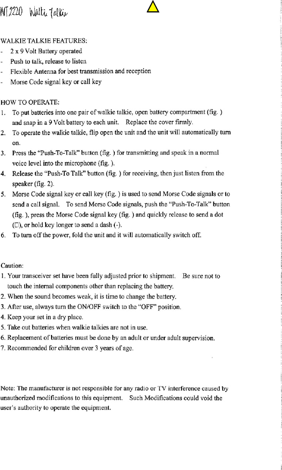 Yick Shun Electronic Toys WT2220 49 MHz Walkie Talkie TX User Manual users manual