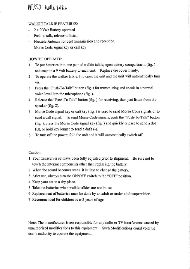Yick Shun Electronic Toys WT2220 49 MHz Walkie Talkie TX User Manual users manual