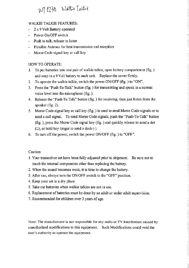 Yick Shun Electronic Toys WT2230 49 MHz Walkie Talkie TX User Manual users manual