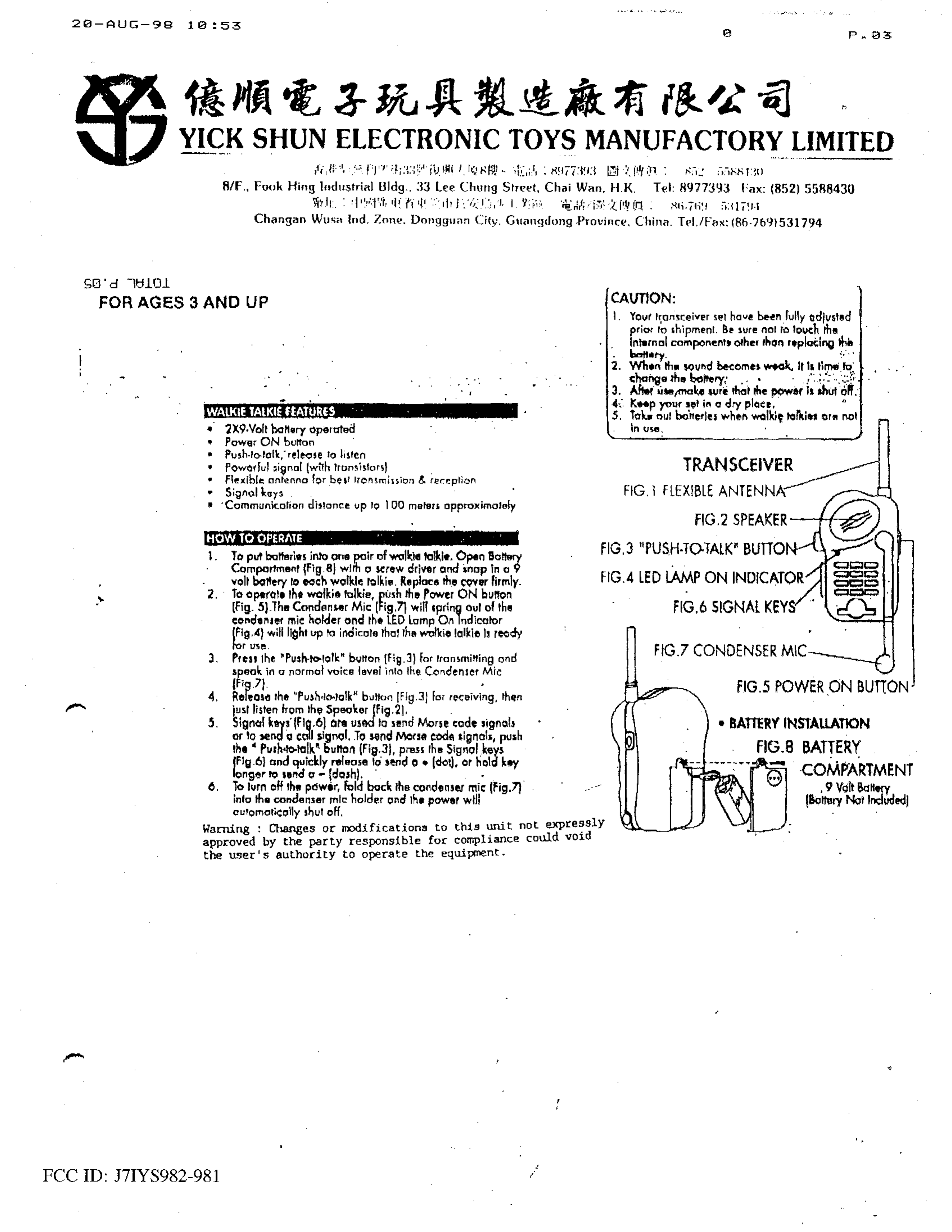 Yick Shun Electronic Toys YS982-981 Toy Walkie Talkie User Manual