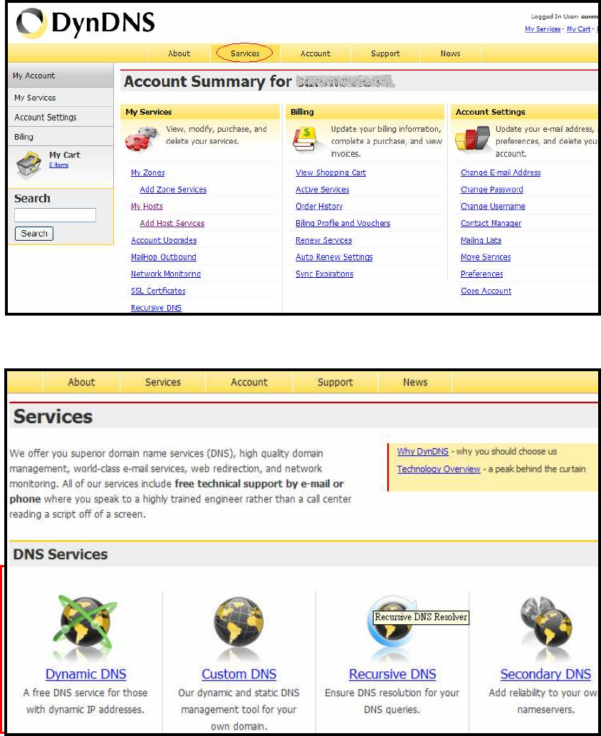 6. Please return to DynDNS website. On the top right hand corner enter the