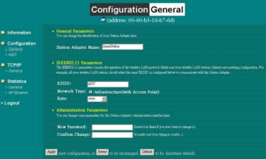 Adapter such as ESSID, Adapter’s name, Rate, IP Address, subnetmask, and default