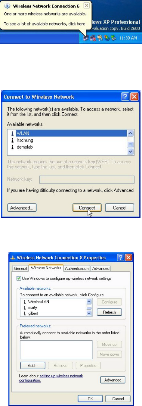 After installing the Wireless LAN PC Card, the Windows XP will display a “Wireless Network
