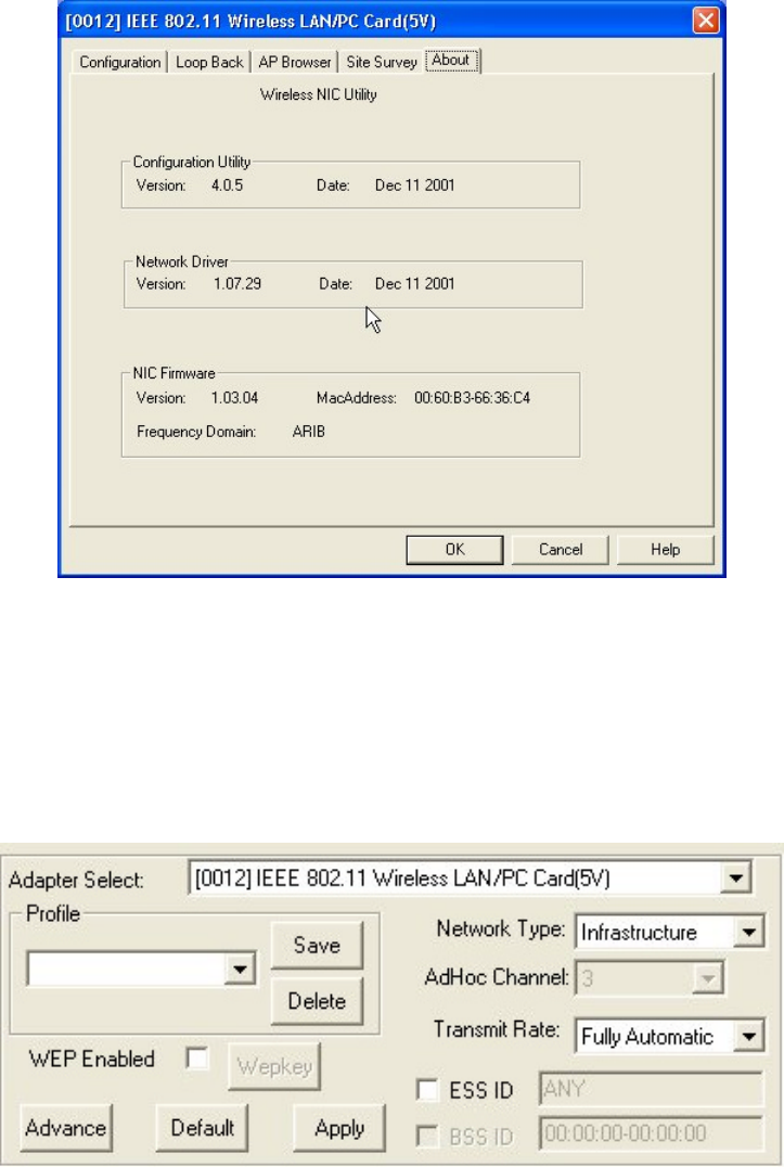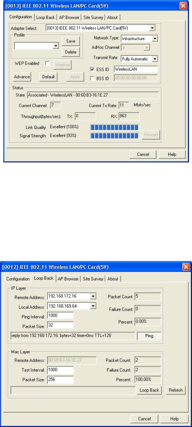 22Mbps Wireless LAN PC Card: Configuration, Loop Back, AP Browser, Site Survey and