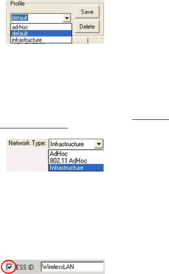 Wireless LAN PC Card such as Profile, Network Type, Channel, Transmit Rate, ESSID,