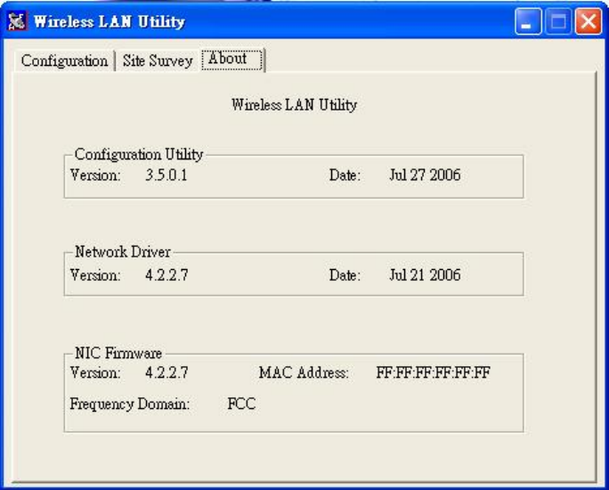 The About item shows the versions of the Wireless LAN Utility, and driver, firmware of the