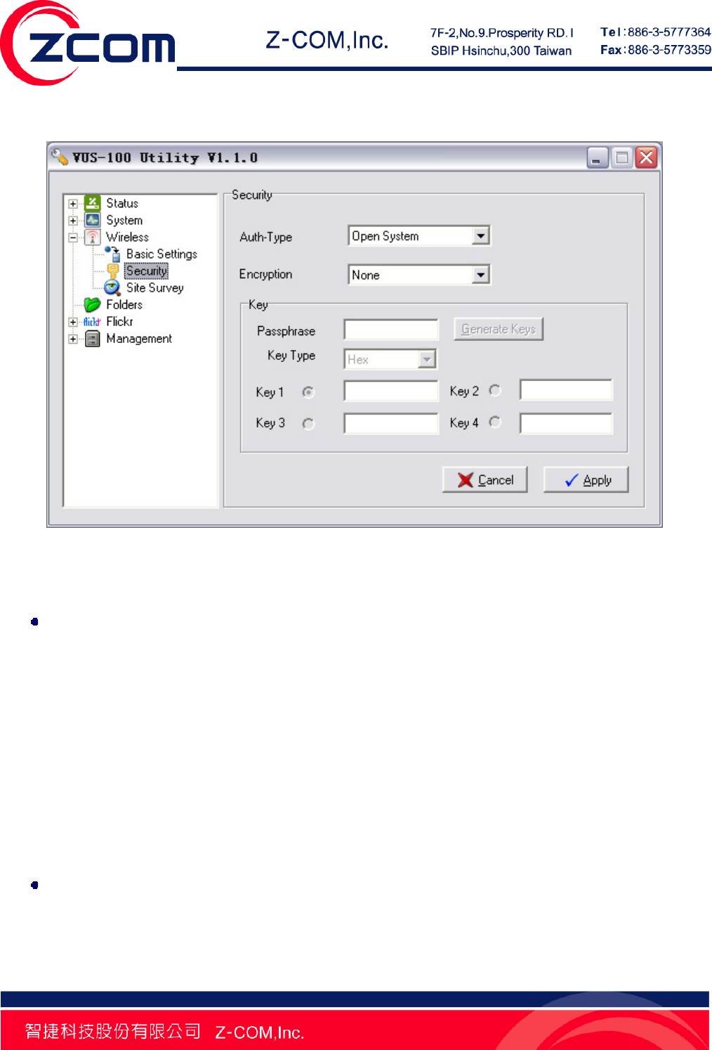 WEP can be configured with a 64-bit or 128-bit Shared Key (hexadecimal number or ACSII). As