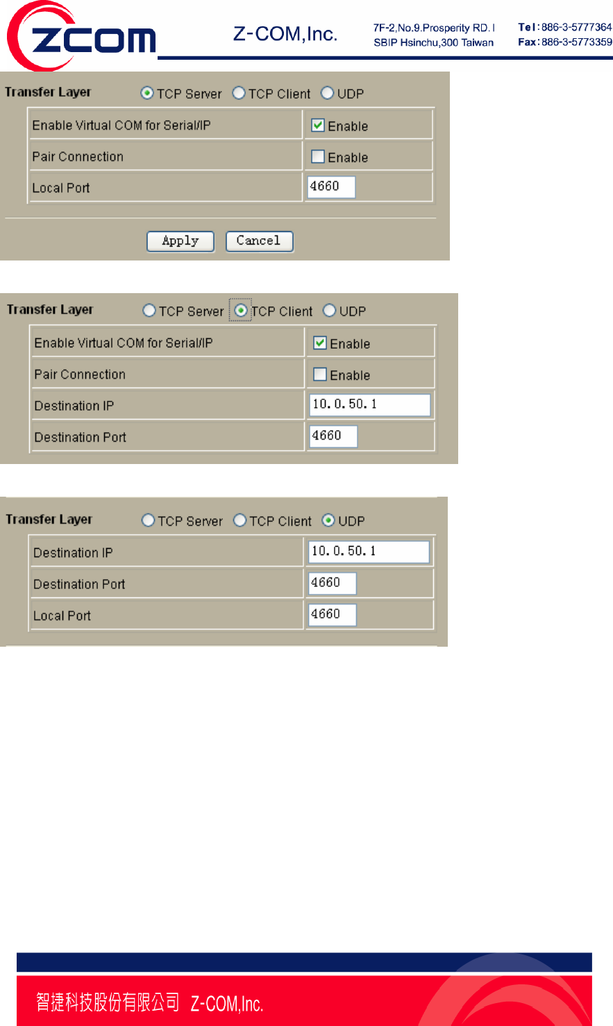 You can select the Transfer Layer from the radio button “TCP Server, TCP Client, UDP”