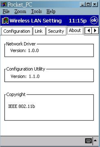 The firmware and driver version of the Wireless LAN CF Card is displayed on the utility
