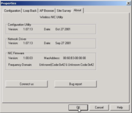The About item shows the versions the Wireless LAN Utility, driver, firmware and utility of