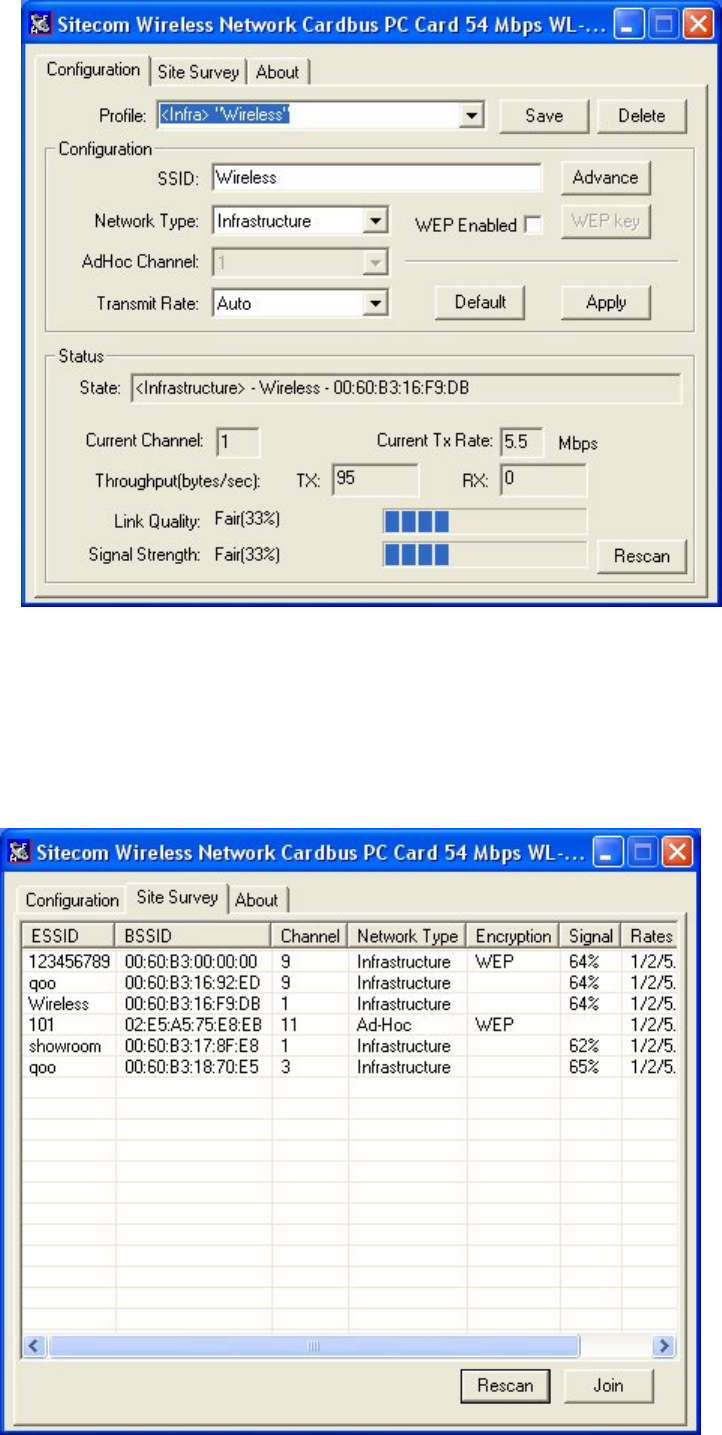 The WLAN Utility consists of window with 3 items for you to monitor and configure the 802.11g