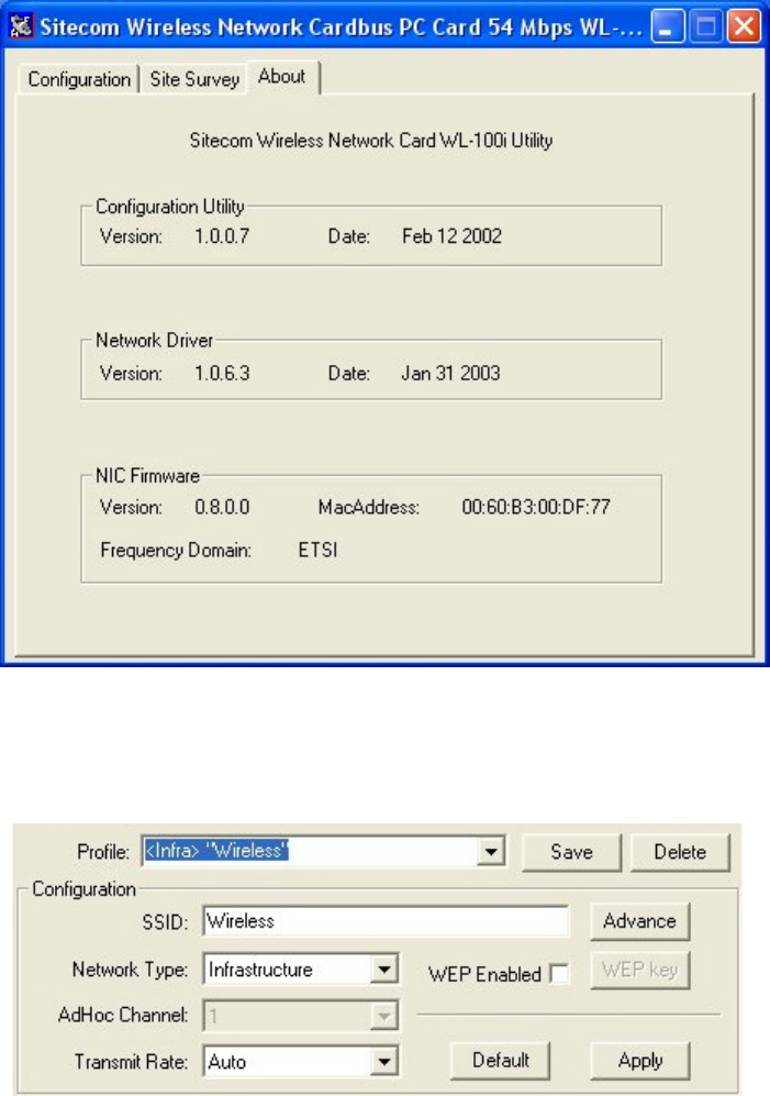 Wireless LAN PCI Adapter: Configuration, Site Survey and About.