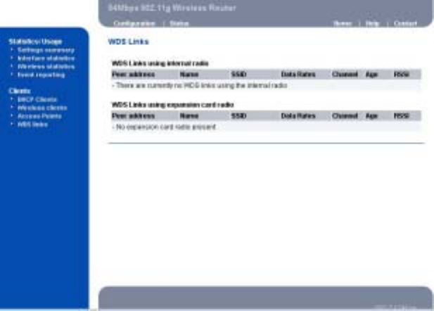 Interfaces statistics, wireless statistics (including association, WDS statistics), DHCP