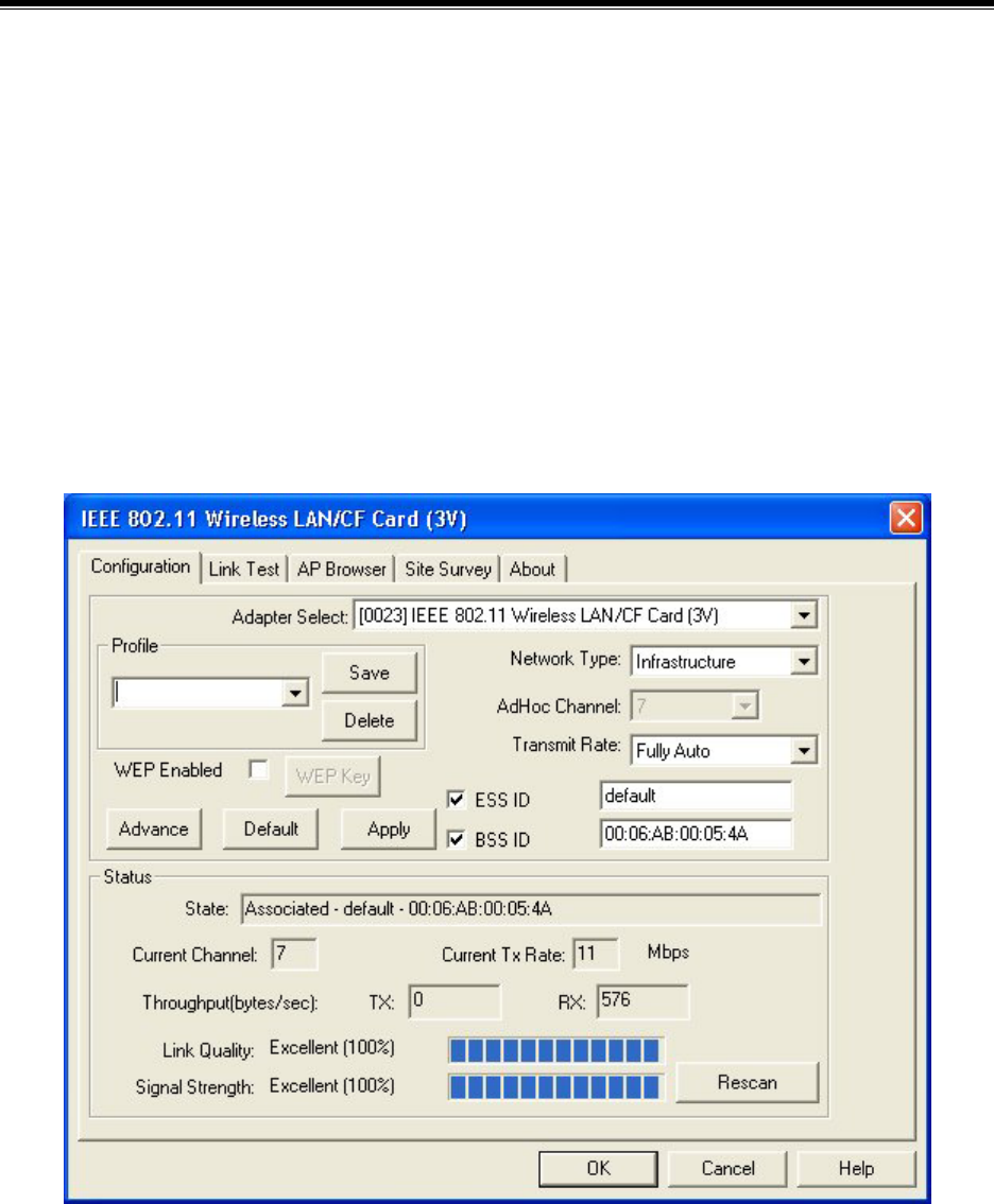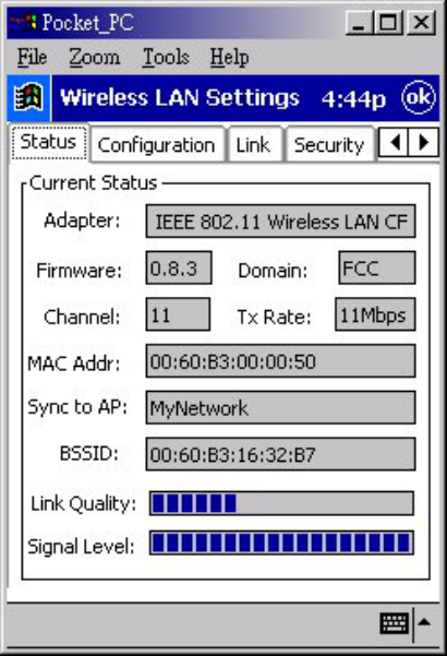 11Mbps Wireless LAN CF Card. Also, the MAC address and frequency domain are displayed.
