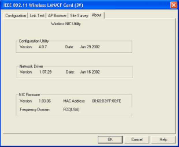 The firmware and driver version of the Wireless LAN CF Card is displayed on the utility