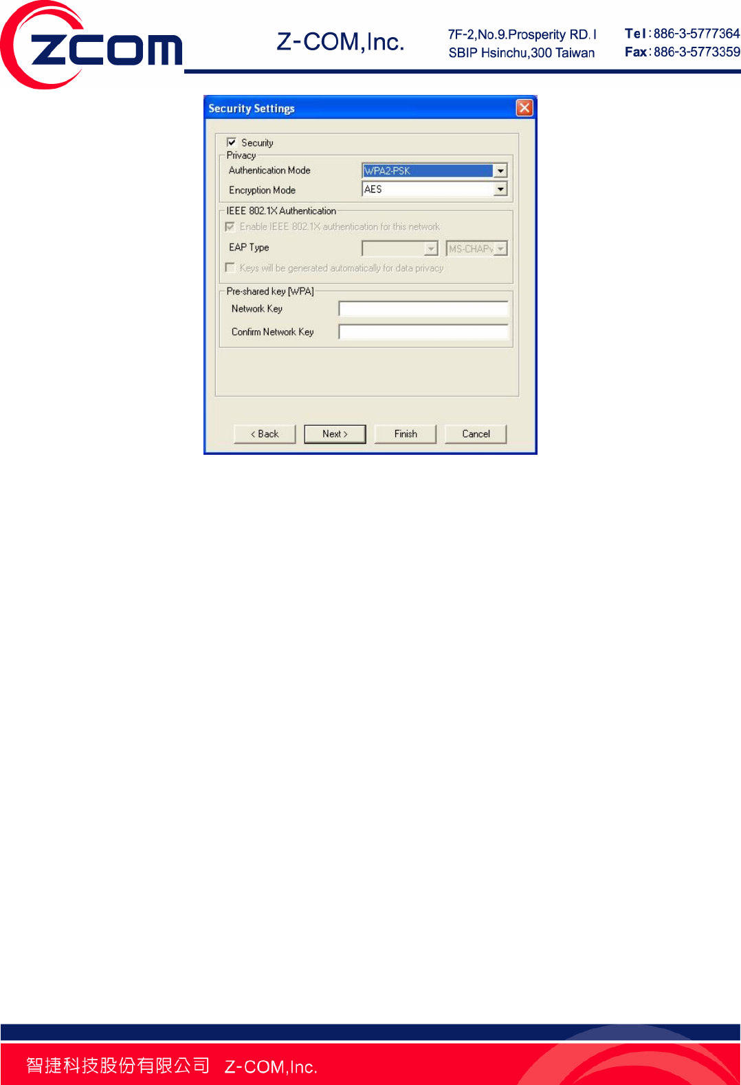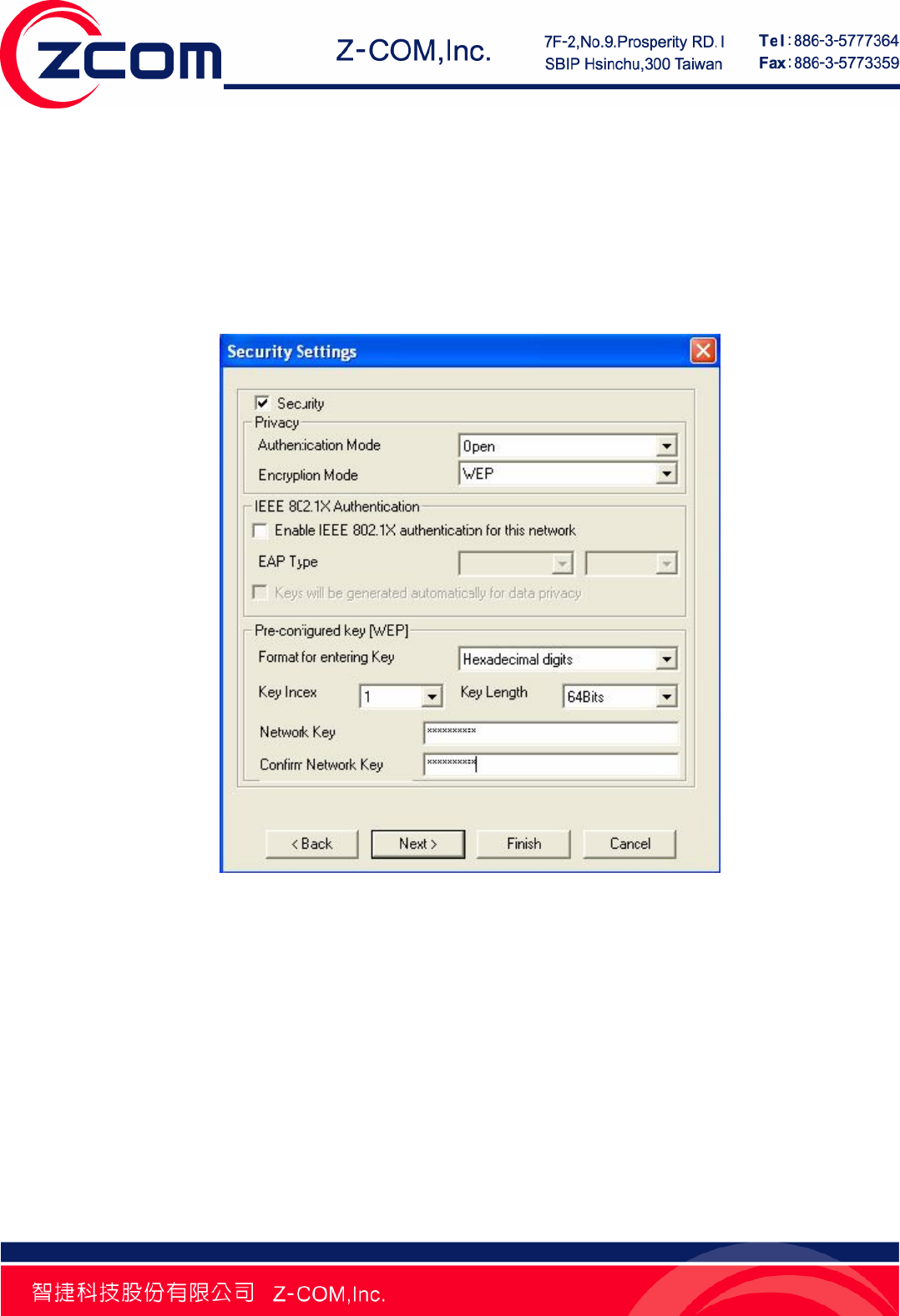 If the wireless security is activated for the selected wireless network, the related fields must be set