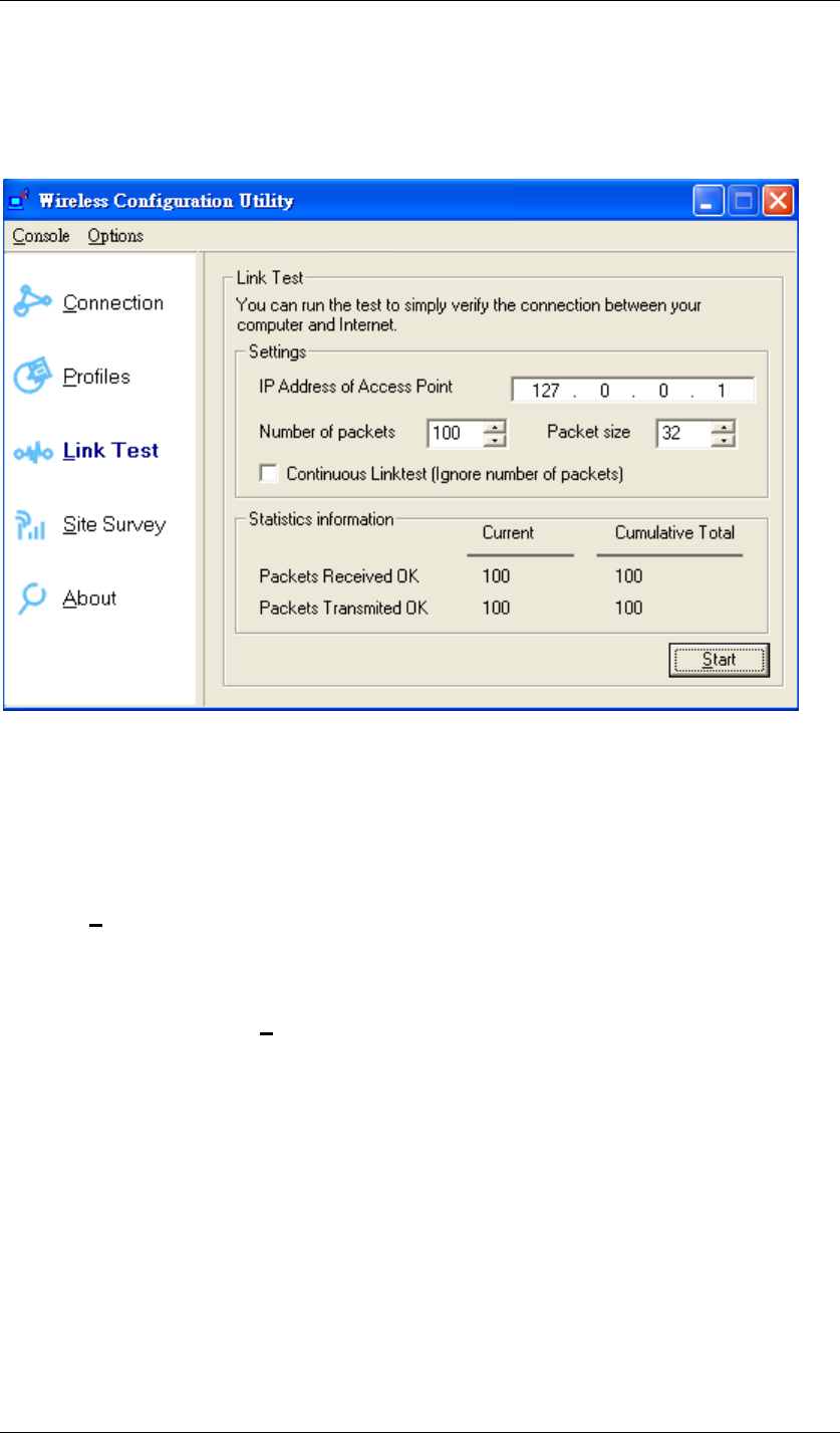 Or click Link Test, fill up the IP address of the access point you connected to, and click Start
