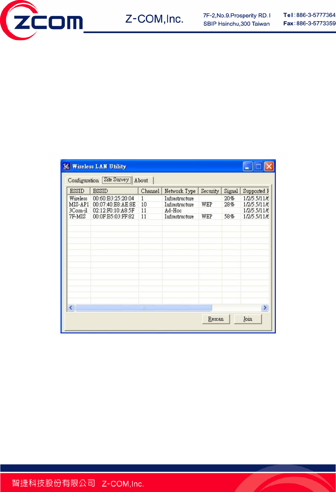 Capability, Signal, and Rates. To join any of the displayed Access Points, highlight the Access