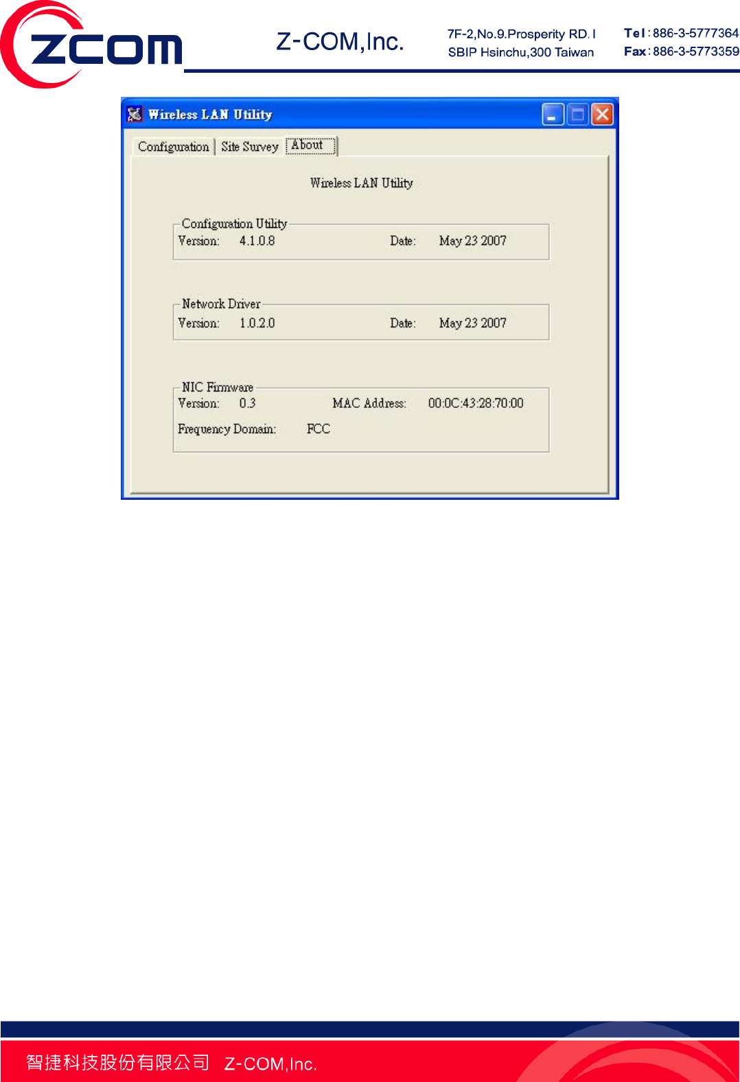 The About item displays related version numbers of the Wireless LAN Utility, and driver, firmware