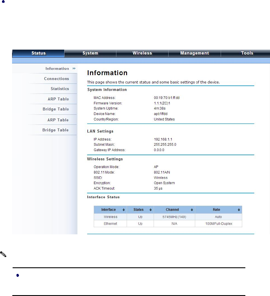 Information includes system information, LAN settings, wireless setting and interface status. Click