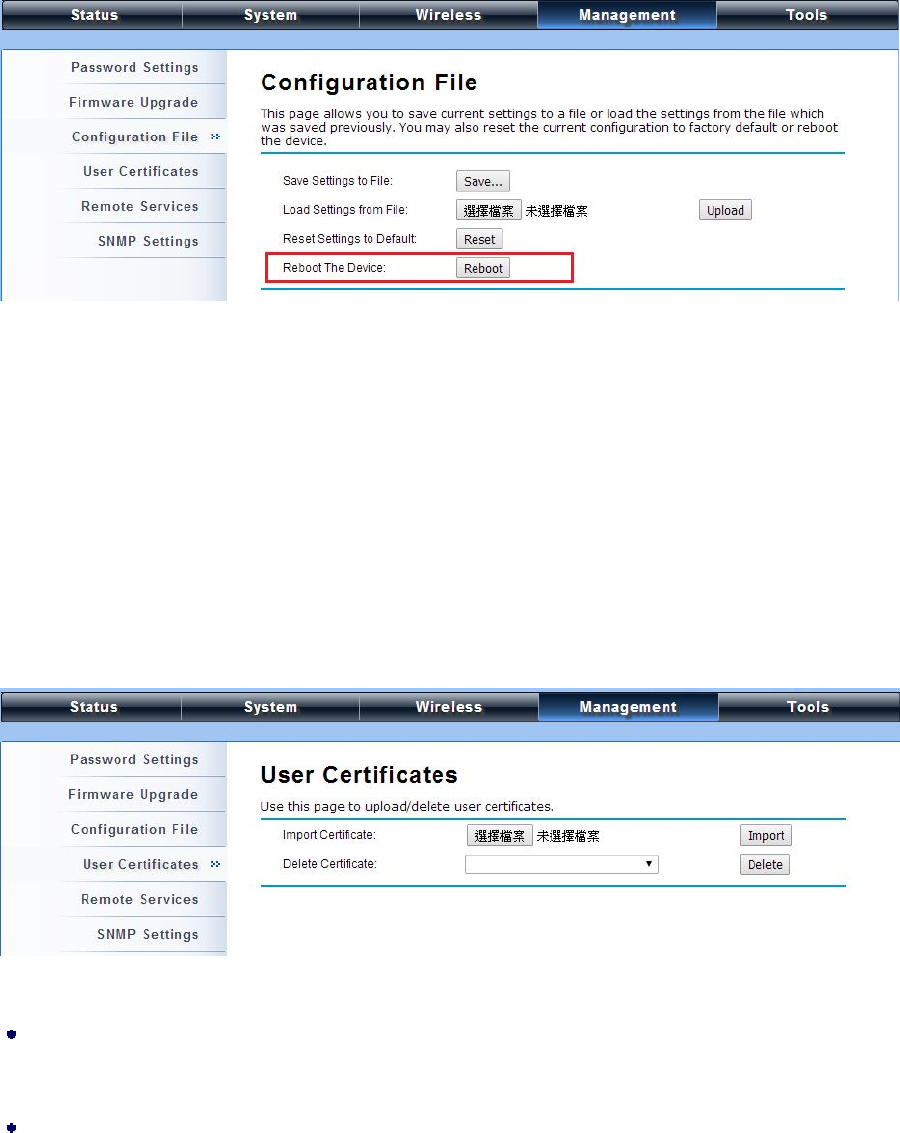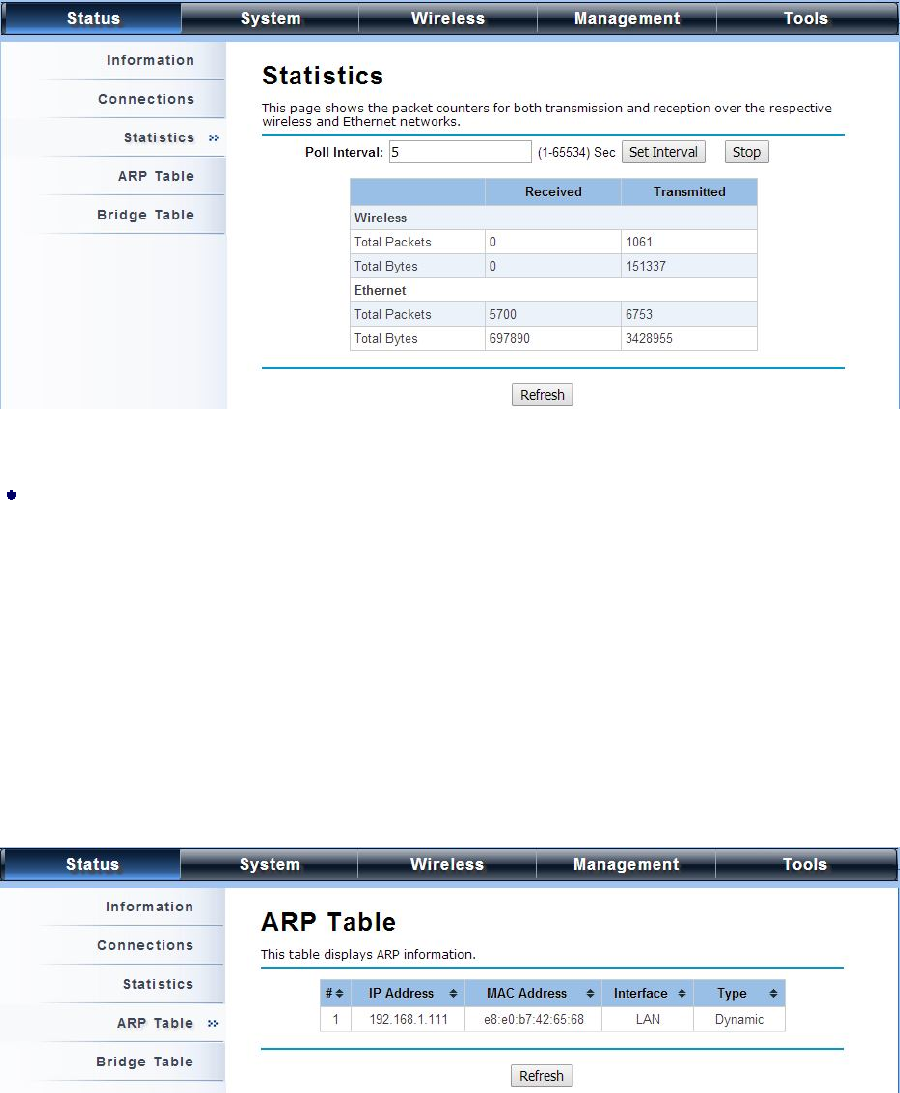Open “Statistics” in “Status” to check the data packets received on and transmitted from the wireless